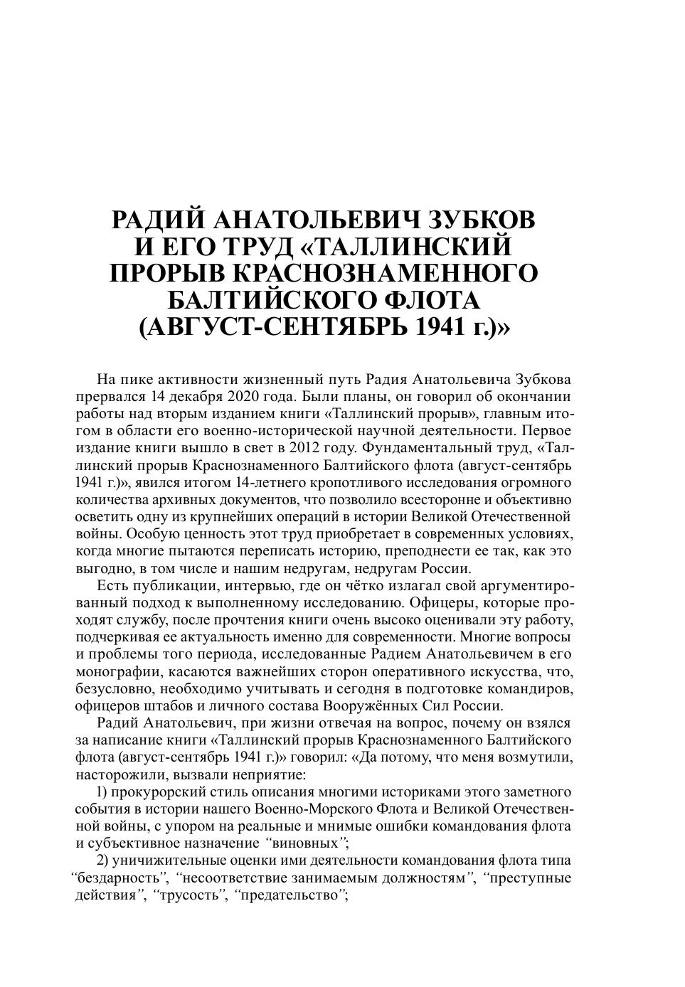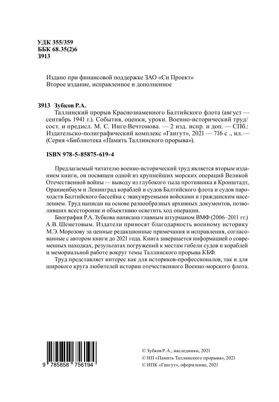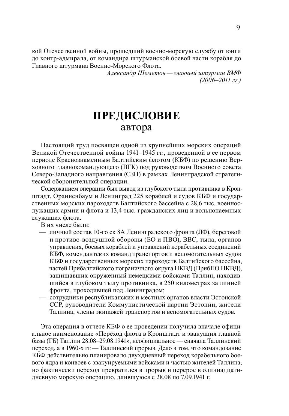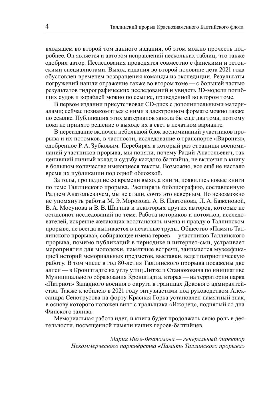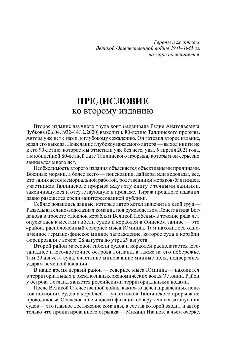 (2006–2011 гг.) А. В. Шеметовым. Издатели приносят благодарность военному историку М. Э. Морозову за ценные редакционные примечания и исправления, согласованные с автором книги до 2021 года. Книга завершается информацией о современных находках, результатах погружений к местам гибели судов и кораблей и мемориальной работе вокруг темы Таллинского прорыва КБФ.