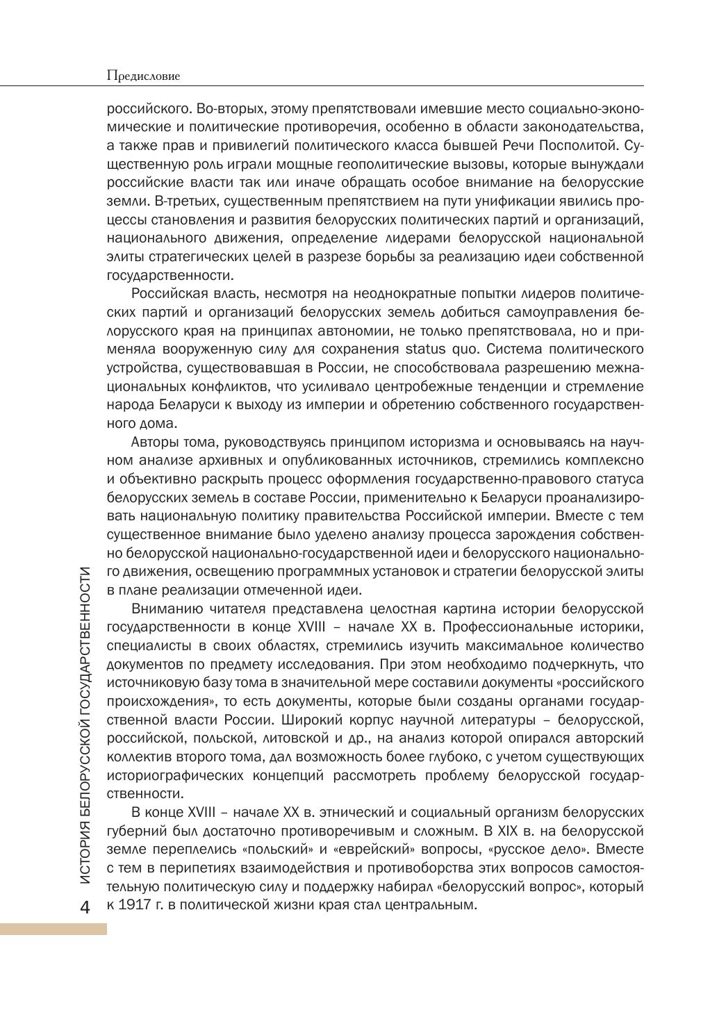 Во втором томе «Истории белорусской государственности» глубоко и всесторонне изучен и охарактеризован государственно-правовой статус белорусских земель в составе Российской империи; рассмотрены основные этапы и особенности, присущие формированию белорусской нации; определено содержание белорусской национальной идеи; отражена политика правительства российского государства в отношении белорусского народа; исследованы закономерности в борьбе белорусских политических партий и организаций за реализацию идеи национальной государственности. Коллективная монография рассчитана на широкий круг читателей: профессиональных историков, преподавателей высших учебных заведений и средних школ, студенческую и учащуюся молодежь, рекомендуется для использования в научно-исследовательской работе и учебном процессе.