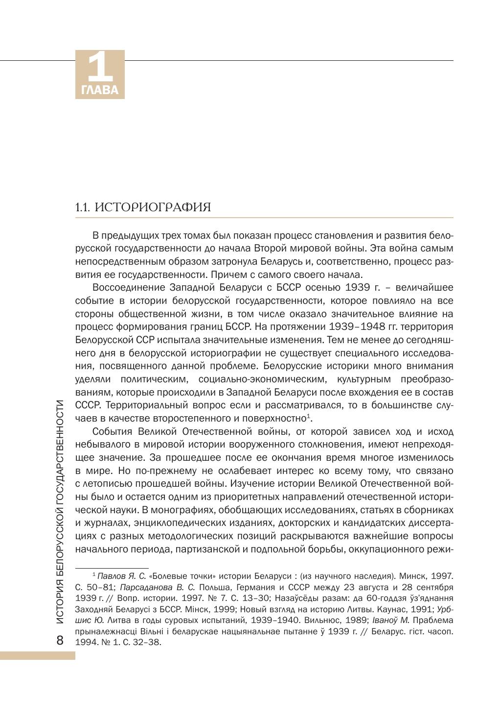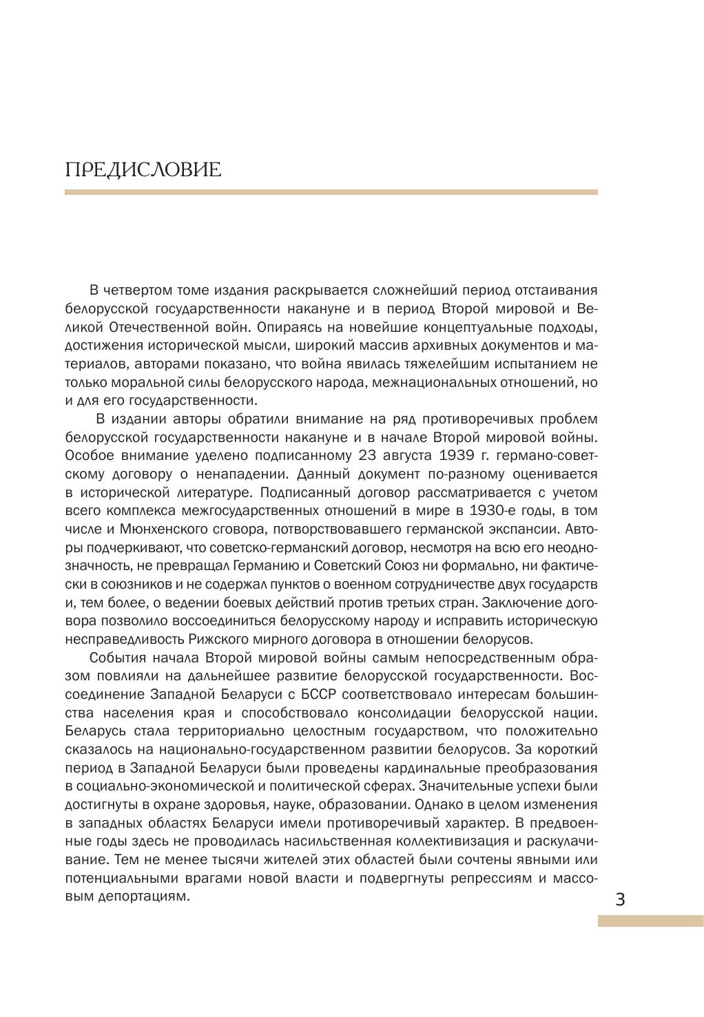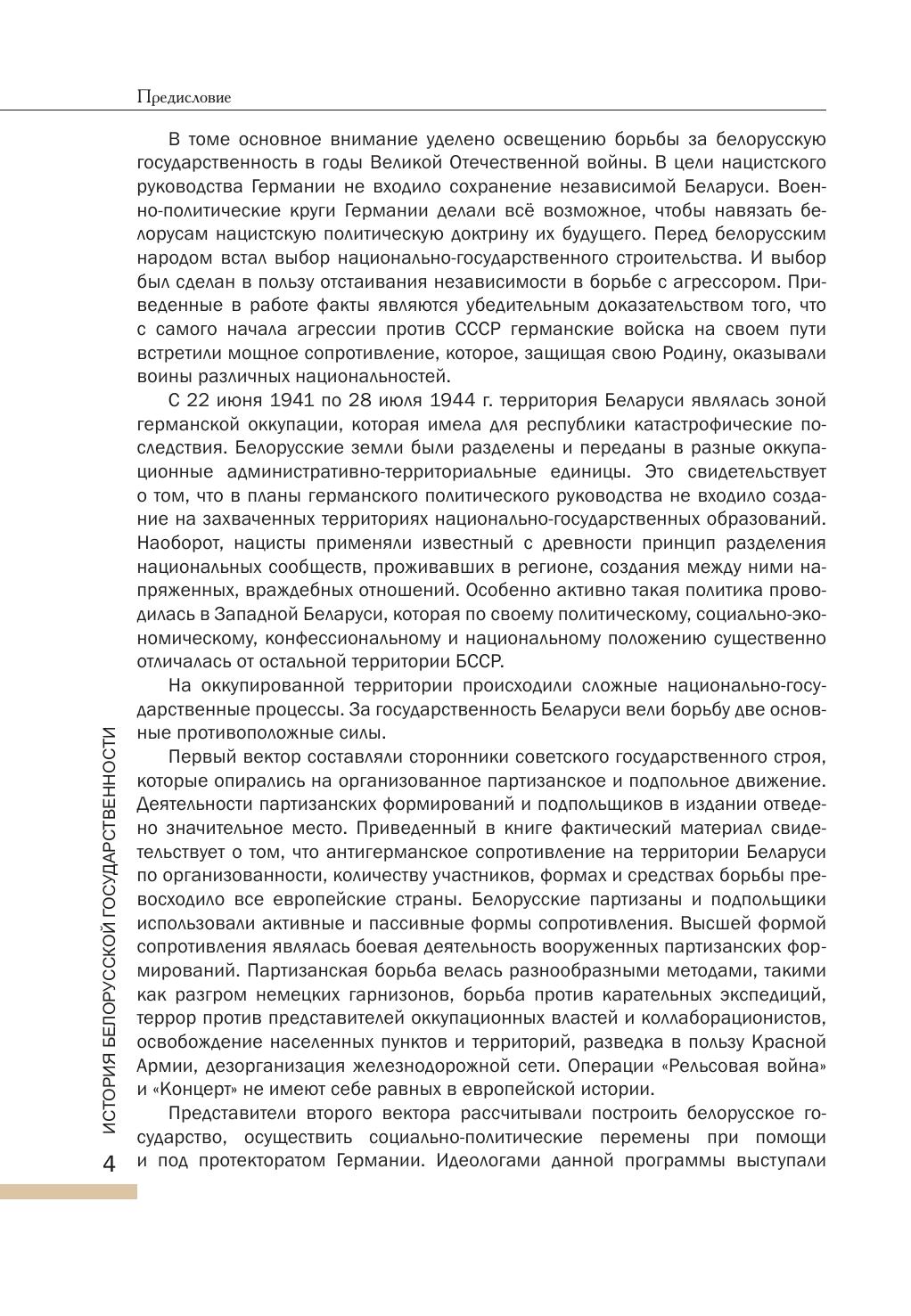 В четвертом томе «Истории белорусской государственности» раскрыто развитие белорусской государственности в период с сентября 1939 по 1953 г. Особое внимание уделено периоду Второй мировой и Великой Отечественной войн, победа в которых сыграла исключительно важную роль в упрочении белорусской государственности. Коллективная монография рассчитана на широкий круг читателей: профессиональных историков, преподавателей высших учебных заведений и средних школ, студенческую и учащуюся молодежь, рекомендуется для использования в научно-исследовательской работе и учебном процессе.
