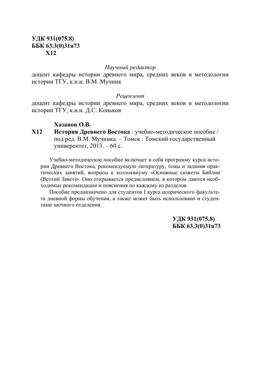 Учебно-методическое пособие включает в себя программу курса истории Древнего Востока, рекомендуемую литературу, темы и задания практических занятий, вопросы к коллоквиуму «Основные сюжеты Библии (Ветхий Завет)». Оно открывается предисловием, в котором даются необходимые рекомендации и пояснения по каждому из разделов. Пособие предназначено для студентов I курса исорического факультета дневной формы обучения, а также может быть использовано и студентами заочного отделения.