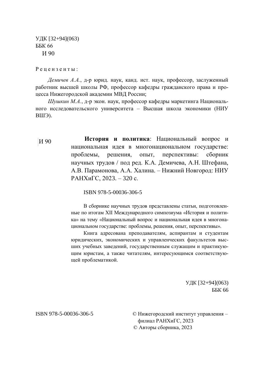 В сборнике научных трудов представлены статьи, подготовленные по итогам XII Международного симпозиума «История и политика» на тему «Национальный вопрос и национальная идея в многонациональном государстве: проблемы, решения, опыт, перспективы». Книга адресована преподавателям, аспирантам и студентам юридических, экономических и управленческих факультетов высших учебных заведений, государственным служащим и практикующим юристам, а также читателям, интересующимся соответствующей проблематикой.