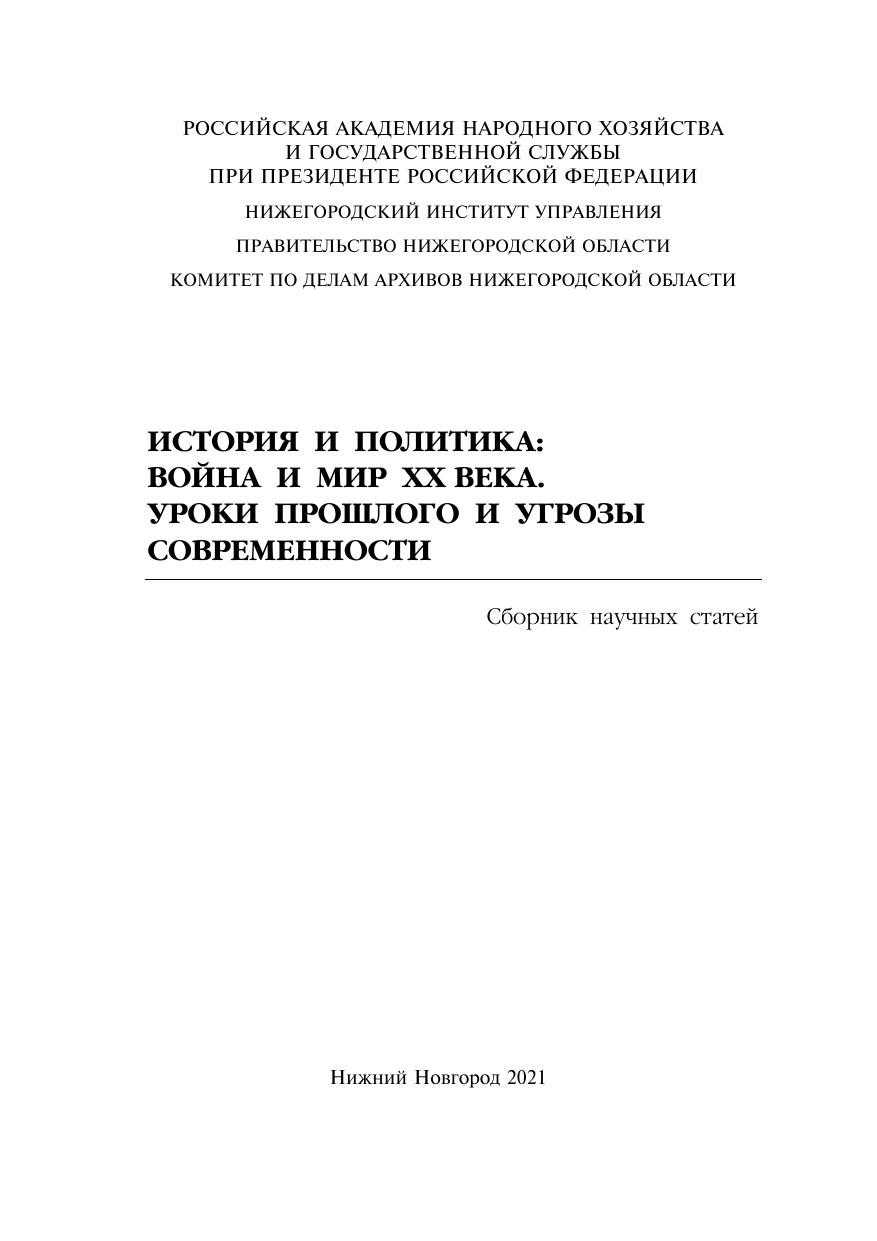 История и политика: Война и мир XX века. Уроки прошлого и угрозы современности: сборник научных трудов по материалам XII всероссийского симпозиума