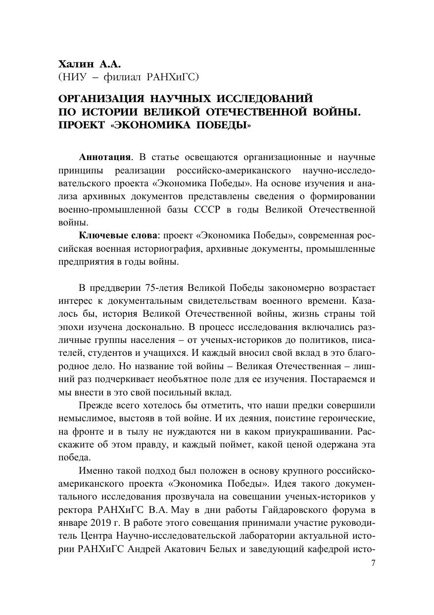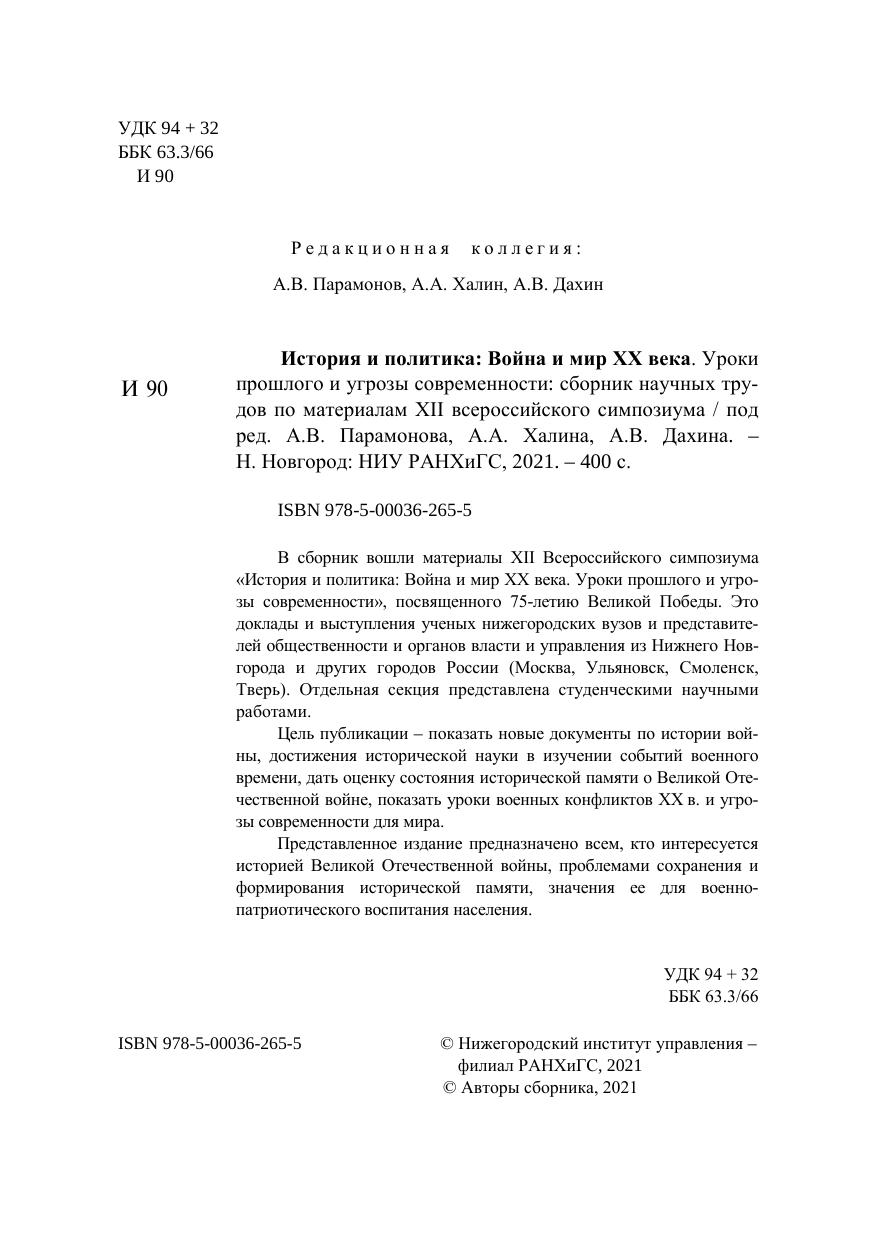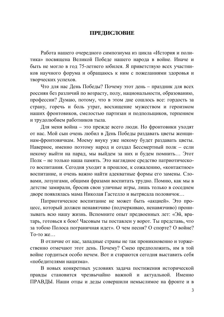 В сборник вошли материалы XII Всероссийского симпозиума «История и политика: Война и мир XX века. Уроки прошлого и угро-зы современности», посвященного 75-летию Великой Победы. Это доклады и выступления ученых нижегородских вузов и представите-лей общественности и органов власти и управления из Нижнего Нов-города и других городов России (Москва, Ульяновск, Смоленск, Тверь). Отдельная секция представлена студенческими научными работами. Цель публикации – показать новые документы по истории вой-ны, достижения исторической науки в изучении событий военного времени, дать оценку состояния исторической памяти о Великой Оте-чественной войне, показать уроки военных конфликтов XX в. и угро-зы современности для мира. Представленное издание предназначено всем, кто интересуется историей Великой Отечественной войны, проблемами сохранения и формирования исторической памяти, значения ее для военно-патриотического воспитания населения.