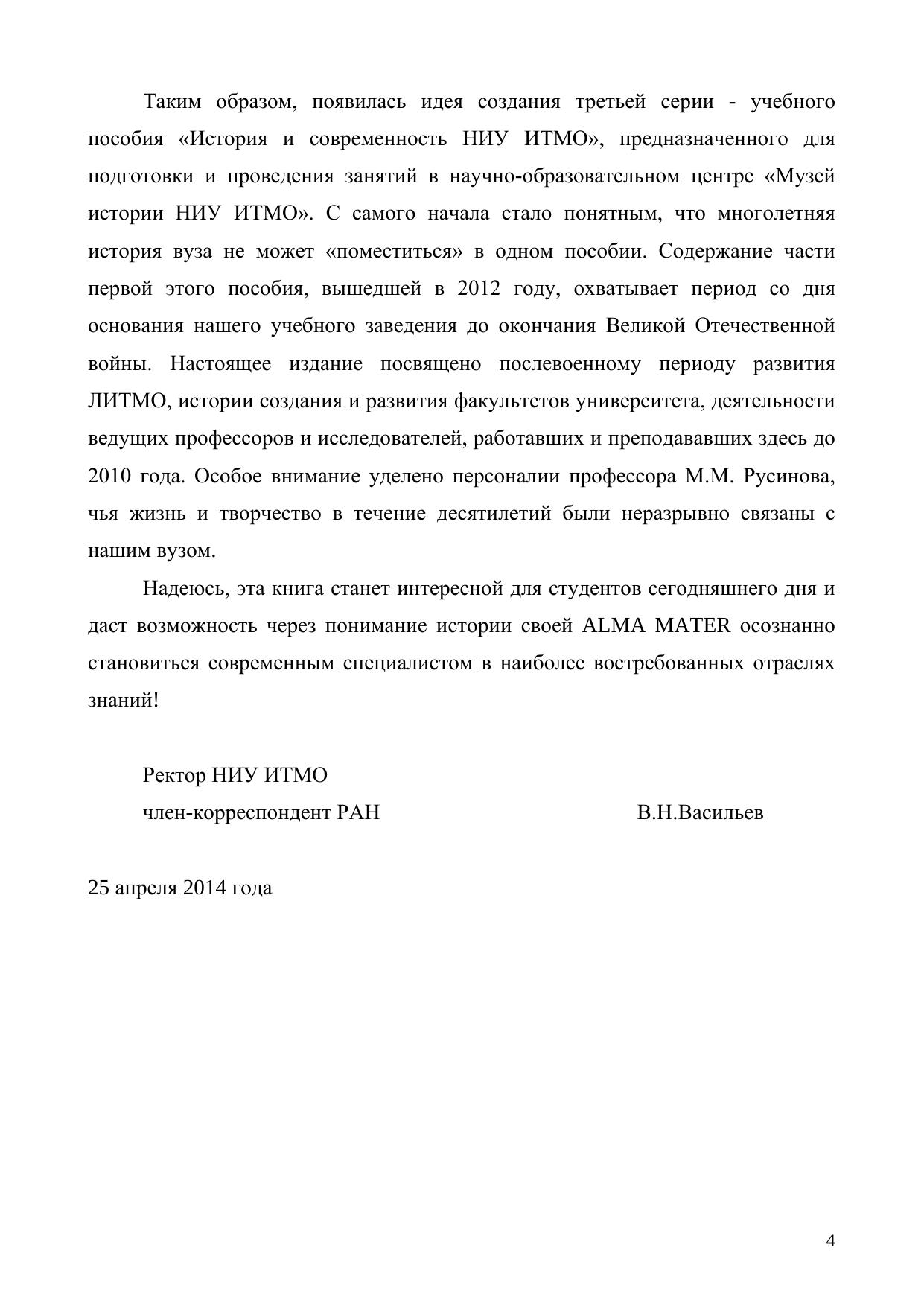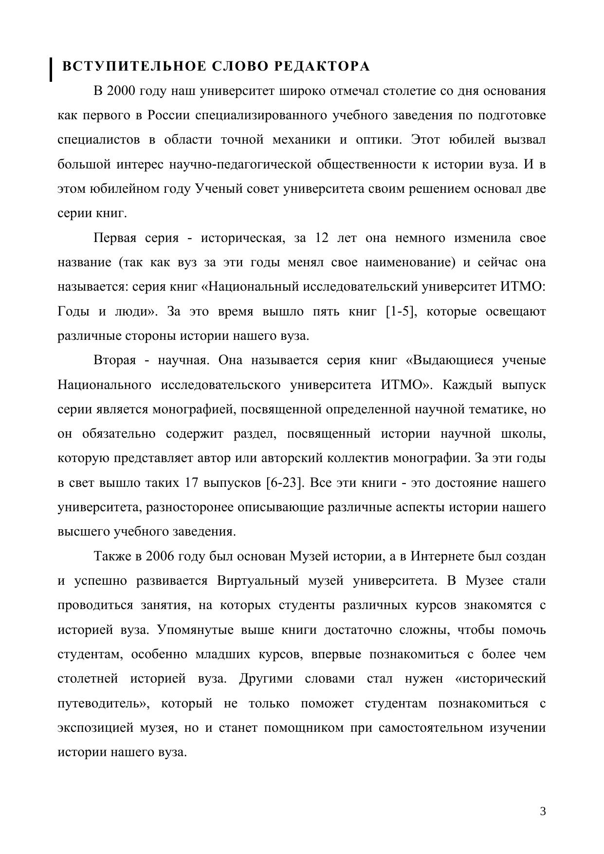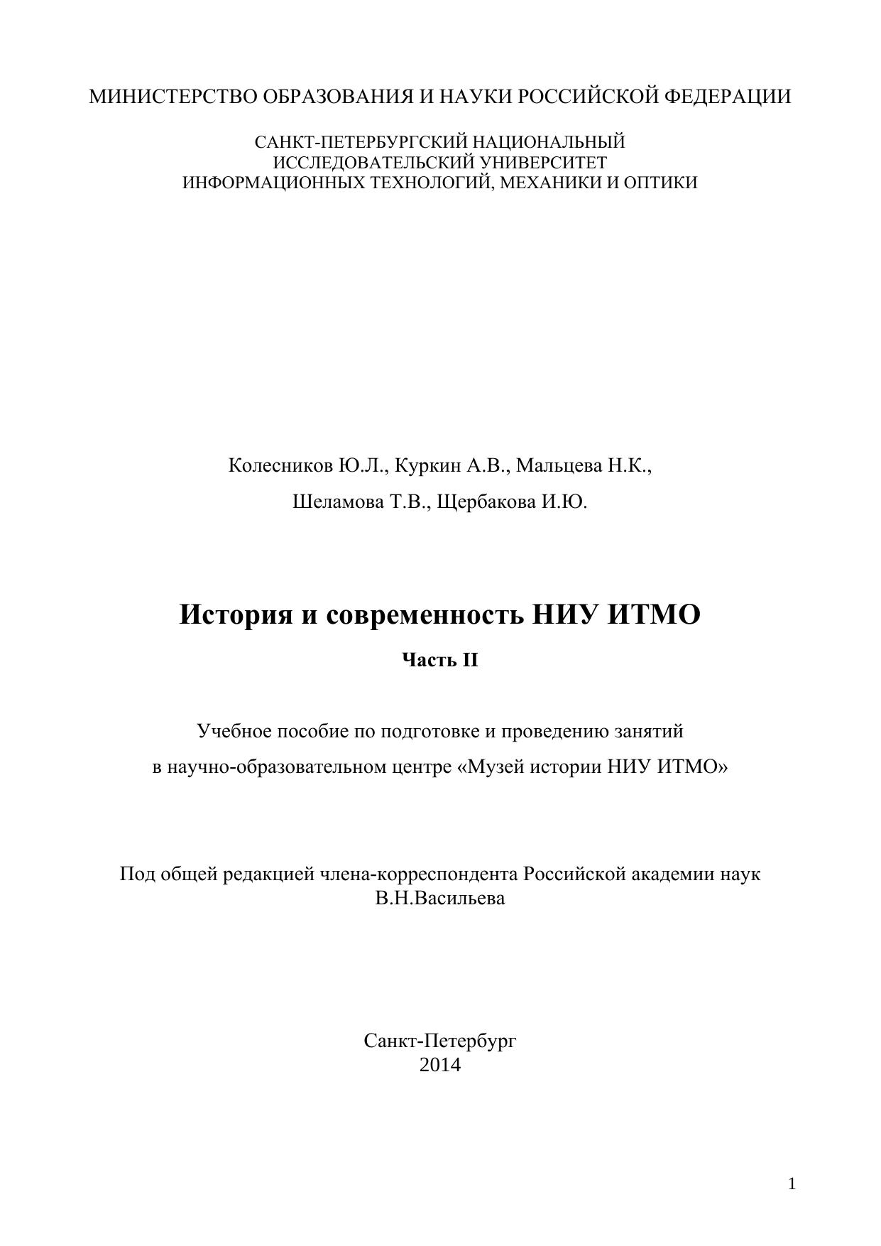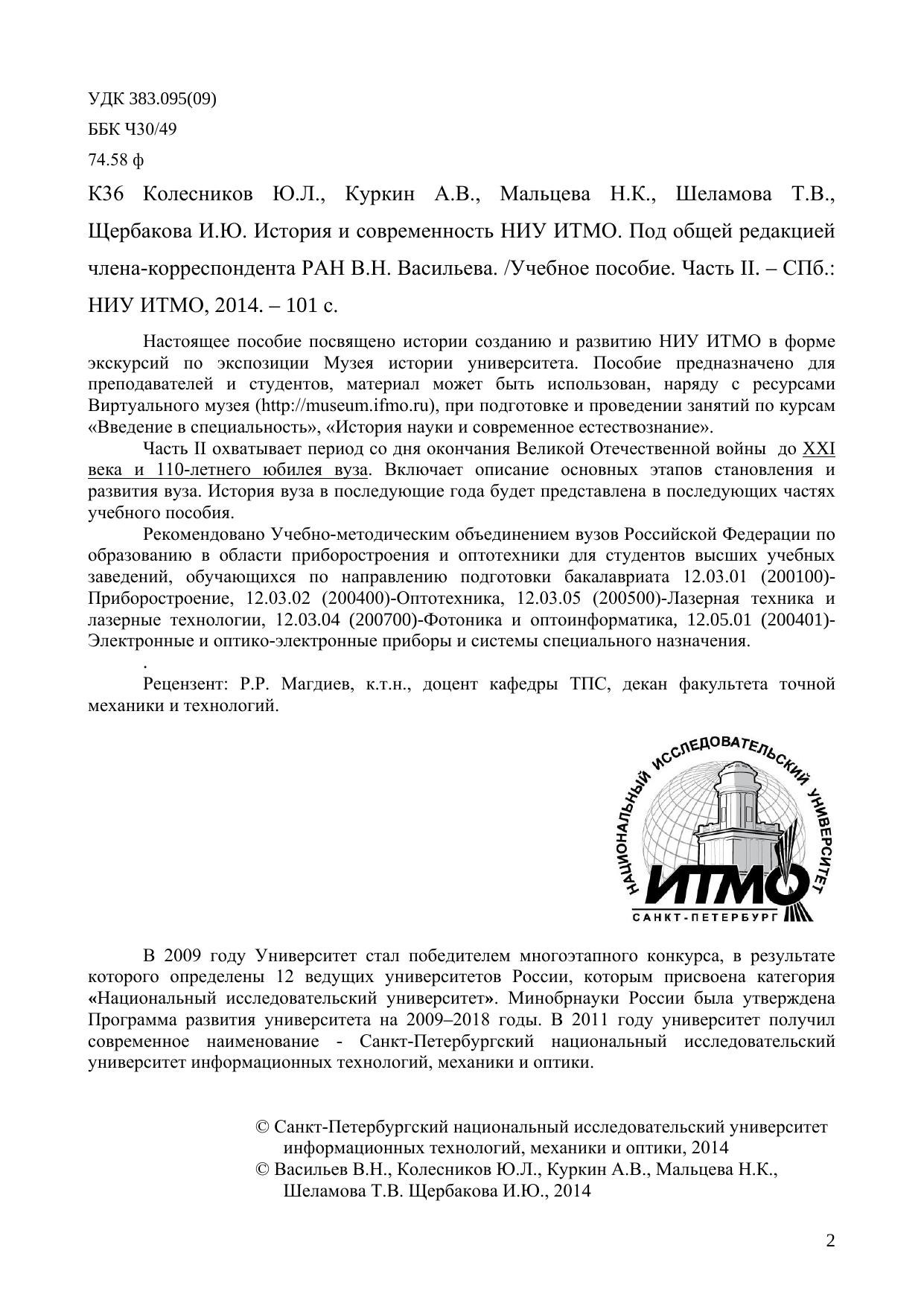 Настоящее пособие посвящено истории созданию и развитию НИУ ИТМО в форме экскурсий по экспозиции Музея истории университета. Пособие предназначено для преподавателей и студентов, материал может быть использован, наряду с ресурсамиВиртуального музея (http://museum.ifmo.ru), при подготовке и проведении занятий по курсам «Введение в специальность», «История науки и современное естествознание». Часть II охватывает период со дня окончания Великой Отечественной войны до XXI века и 110-летнего юбилея вуза. Включает описание основных этапов становления и развития вуза. История вуза в последующие года будет представлена в последующих частях учебного пособия. Рекомендовано Учебно-методическим объединением вузов Российской Федерации по образованию в области приборостроения и оптотехники для студентов высших учебных заведений, обучающихся по направлению подготовки бакалавриата 12.03.01 (200100)- Приборостроение, 12.03.02 (200400)-Оптотехника, 12.03.05 (200500)-Лазерная техника и лазерные технологии, 12.03.04 (200700)-Фотоника и оптоинформатика, 12.05.01 (200401)- Электронные и оптико-электронные приборы и системы специального назначения.