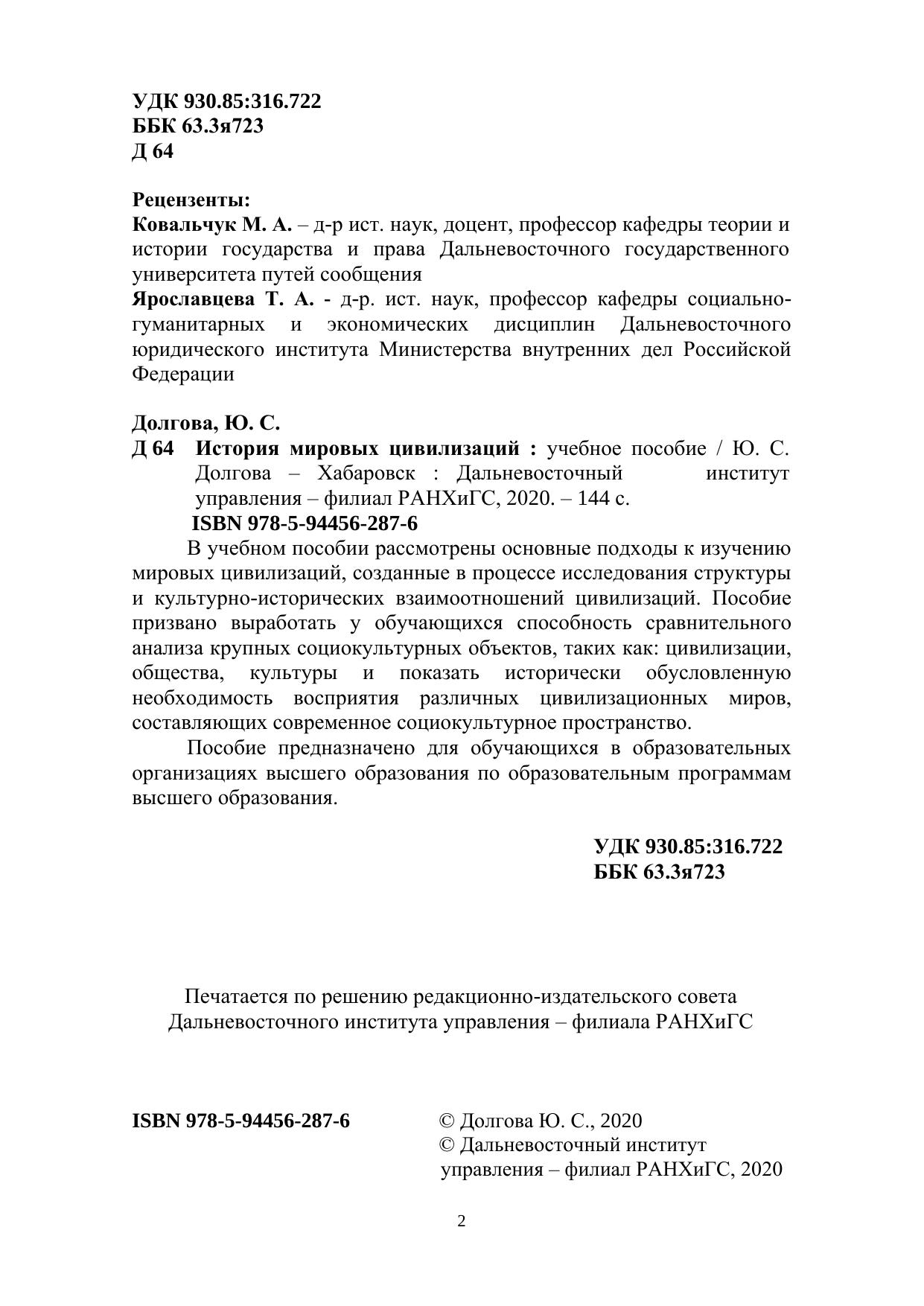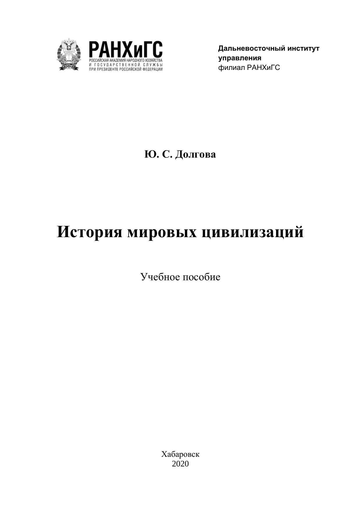 В учебном пособии рассмотрены основные подходы к изучению мировых цивилизаций, созданные в процессе исследования структуры и культурно-исторических взаимоотношений цивилизаций. Пособие призвано выработать у обучающихся способность сравнительного анализа крупных социокультурных объектов, таких как: цивилизации, общества, культуры и показать исторически обусловленную необходимость восприятия различных цивилизационных миров, составляющих современное социокультурное пространство. Пособие предназначено для обучающихся в образовательных организациях высшего образования по образовательным программам высшего образования.
