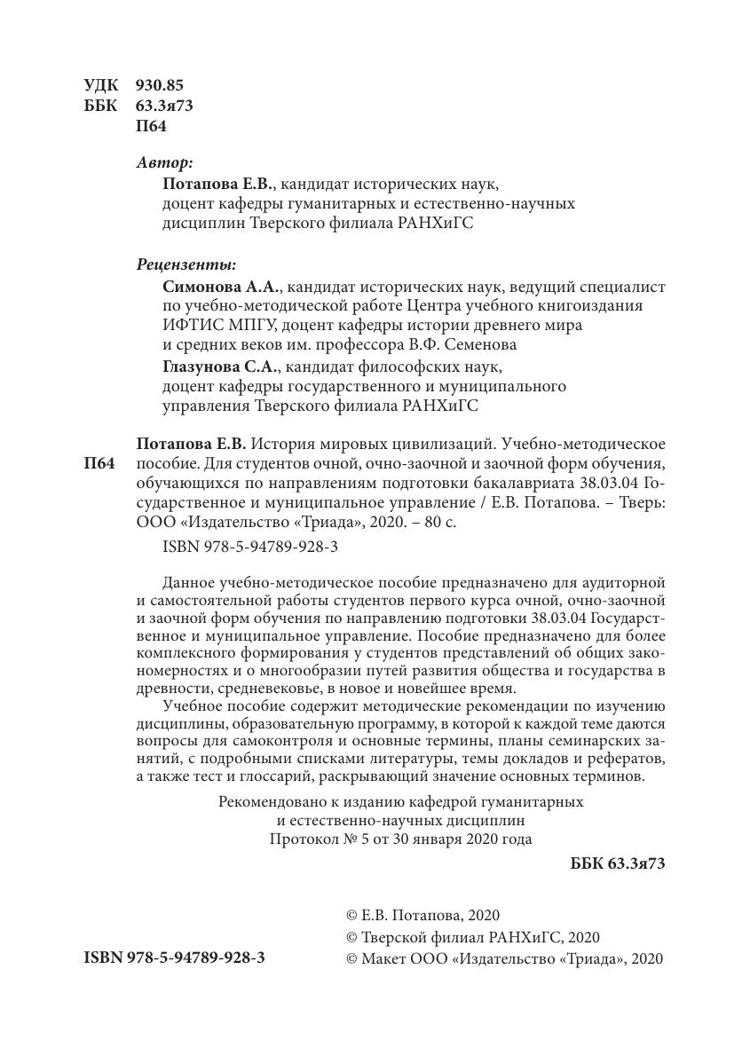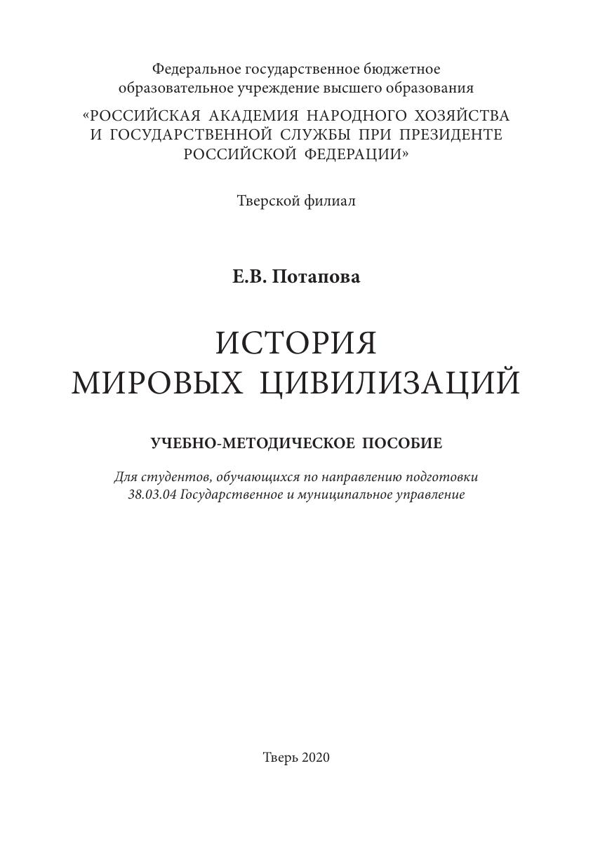 Данное учебно-методическое пособие предназначено для аудиторной и самостоятельной работы студентов первого курса очной, очно-заочной и заочной форм обучения по направлению подготовки 38.03.04 Государственное и муниципальное управление. Пособие предназначено для более комплексного формирования у студентов представлений об общих закономерностях и о многообразии путей развития общества и государства в древности, средневековье, в новое и новейшее время. Учебное пособие содержит методические рекомендации по изучению дисциплины, образовательную программу, в которой к каждой теме даются вопросы для самоконтроля и основные термины, планы семинарских занятий, с подробными списками литературы, темы докладов и рефератов, а также тест и глоссарий, раскрывающий значение основных терминов.