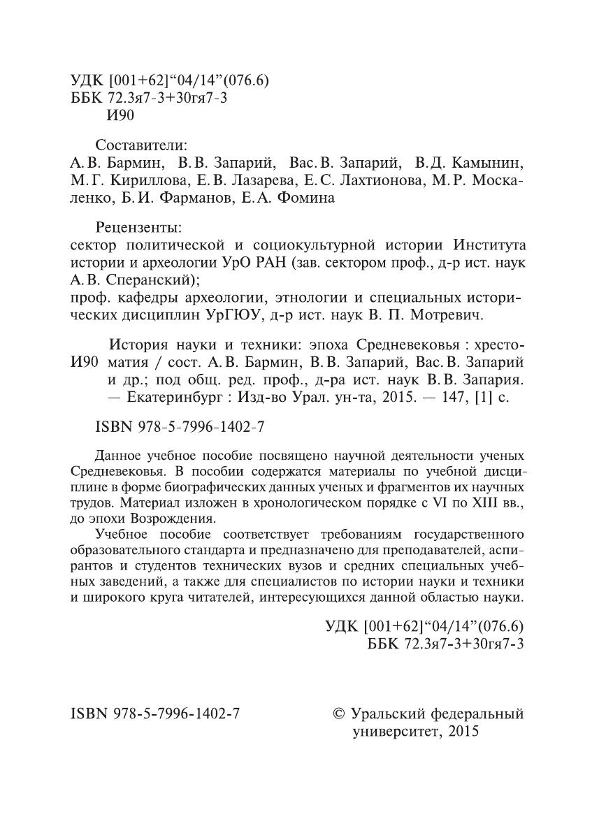 Данное учебное пособие посвящено научной деятельности ученых Средневековья. В пособии содержатся материалы по учебной дисциплине в форме биографических данных ученых и фрагментов их научных трудов. Материал изложен в хронологическом порядке с VI по XIII вв., до эпохи Возрождения. Учебное пособие соответствует требованиям государственного образовательного стандарта и предназначено для преподавателей, аспирантов и студентов технических вузов и средних специальных учебных заведений, а также для специалистов по истории науки и техники и широкого круга читателей, интересующихся данной областью науки.