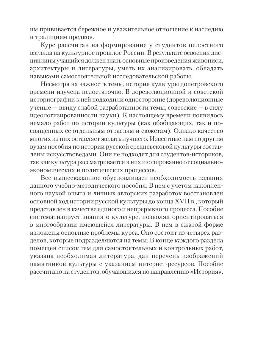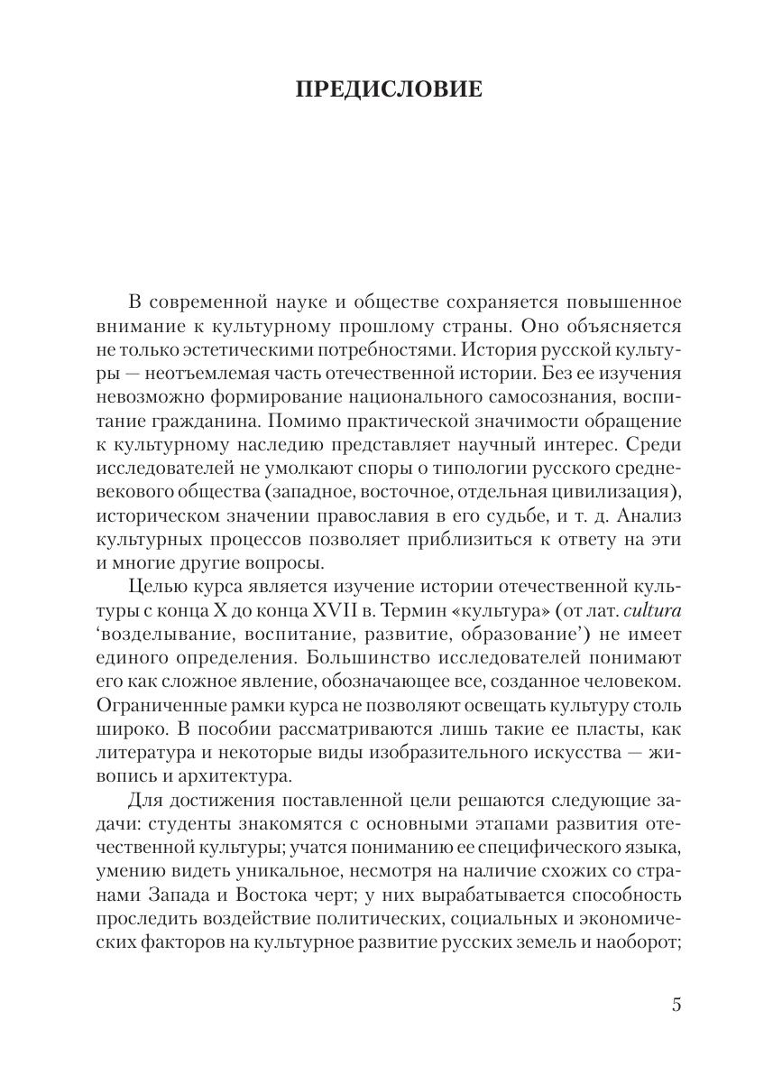 Анализируются основные этапы развития отечественной культуры с конца X в. до конца XVII в. Дана характеристика выдающихся произведений изобразительного искусства и литературы. Продемонстрирована связь культурных процессов с социально-экономической и политической историей восточно-славянских земель. Отдельное внимание уделено выявлению специфических черт русской средневековой культуры. Для студентов, обучающихся по направлению «История».
