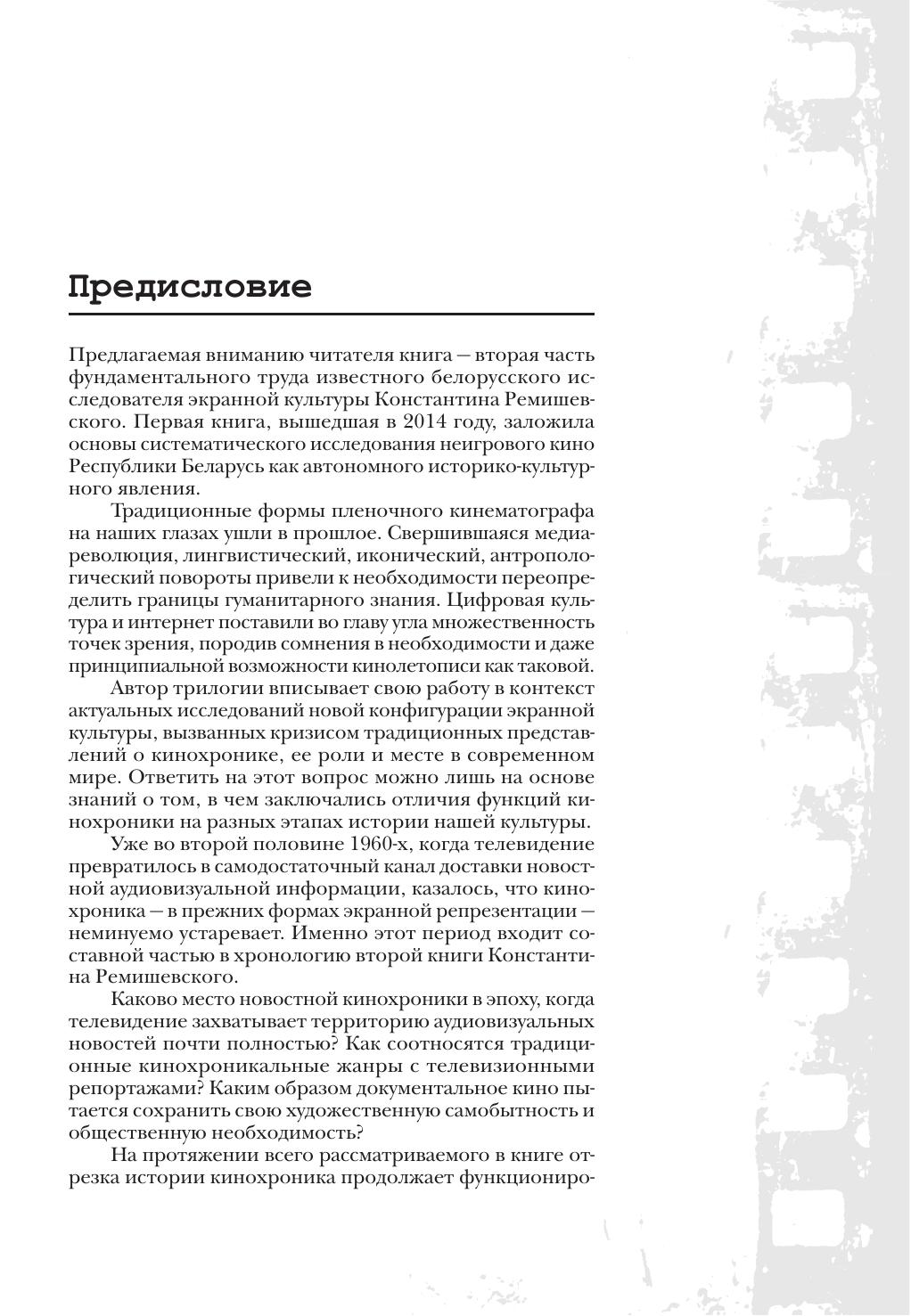 Вторая книга трилогии, посвященной исследованию белорусской кинолетописи, охватывает 1954–1969 годы – событийно насыщенный и чрезвычайно плодотворный в творческо-производственном отношении период развития белорусской хроникально-документальной и научно-популярной кинематографии. Электронное приложение позволит составить впечатление о разнообразных творческих подходах к представлению жизни людей на документальном экране.