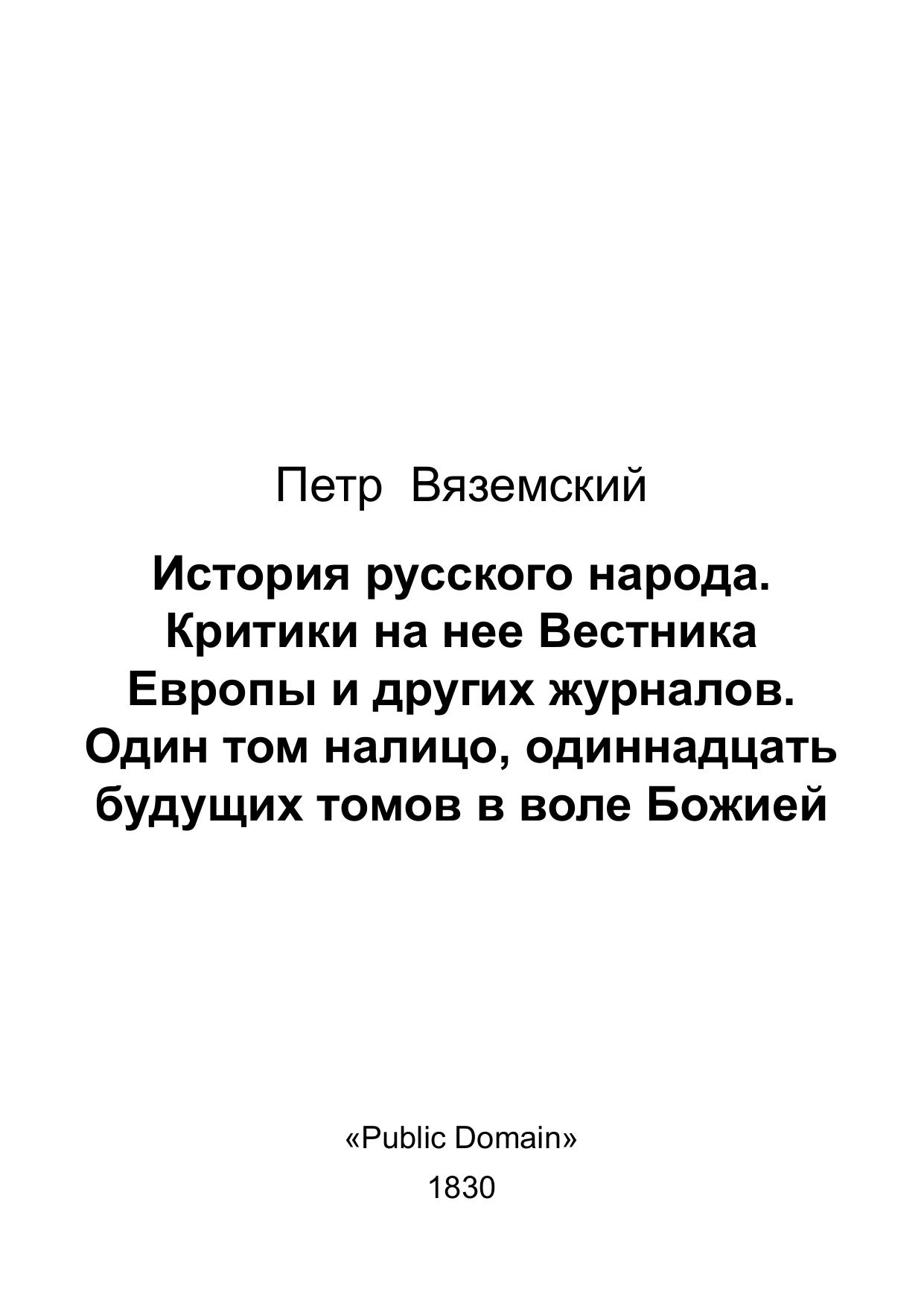 История русского народа. Критики на нее Вестника Европы и других журналов. Один том налицо, одиннадцать будущих томов в воле Божией