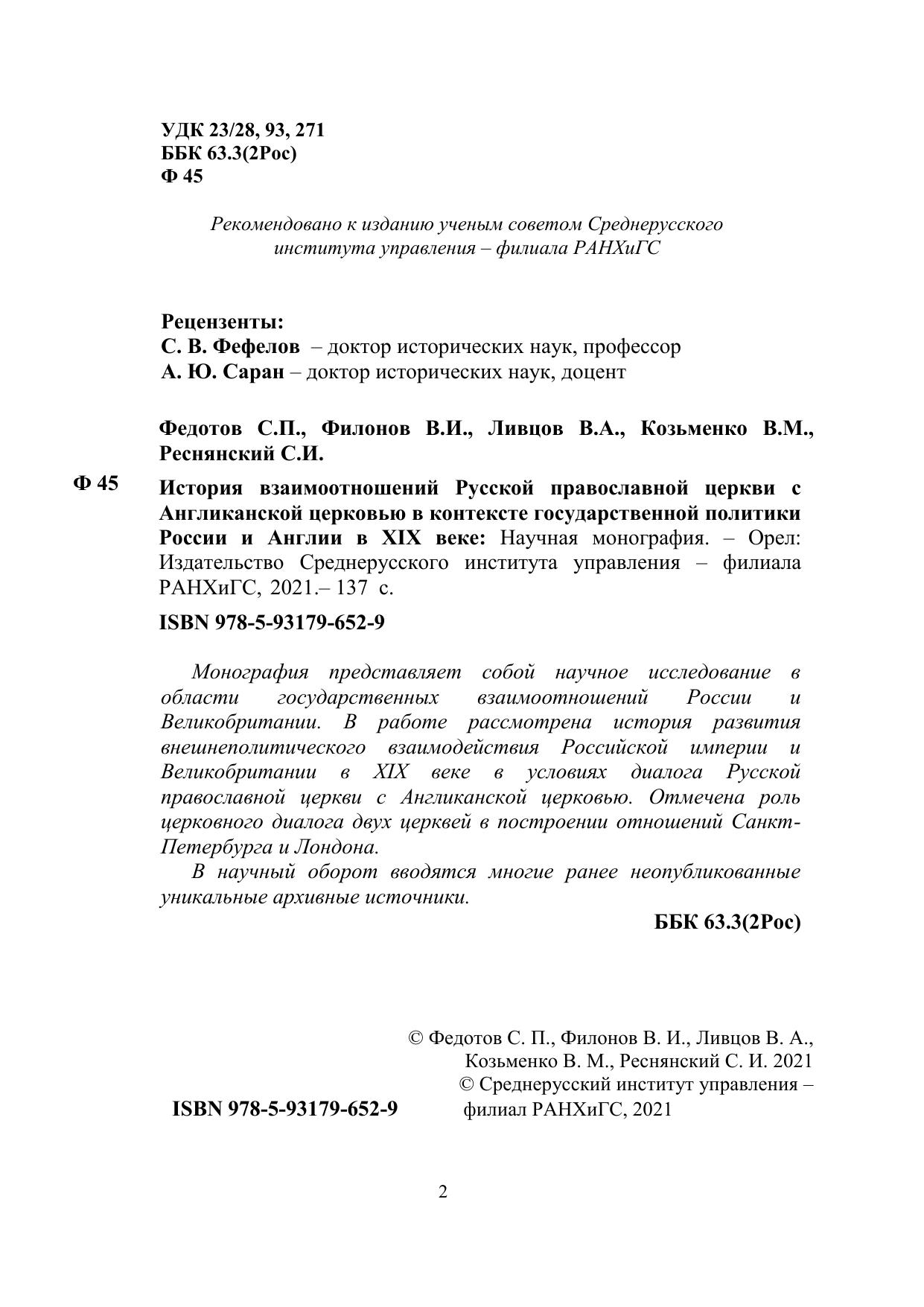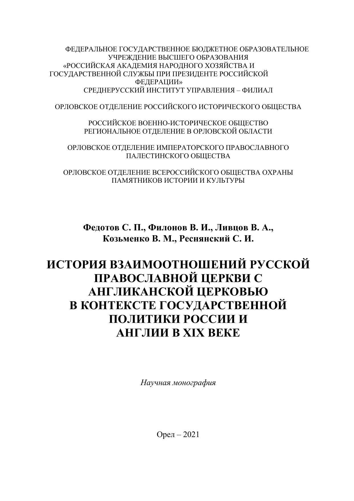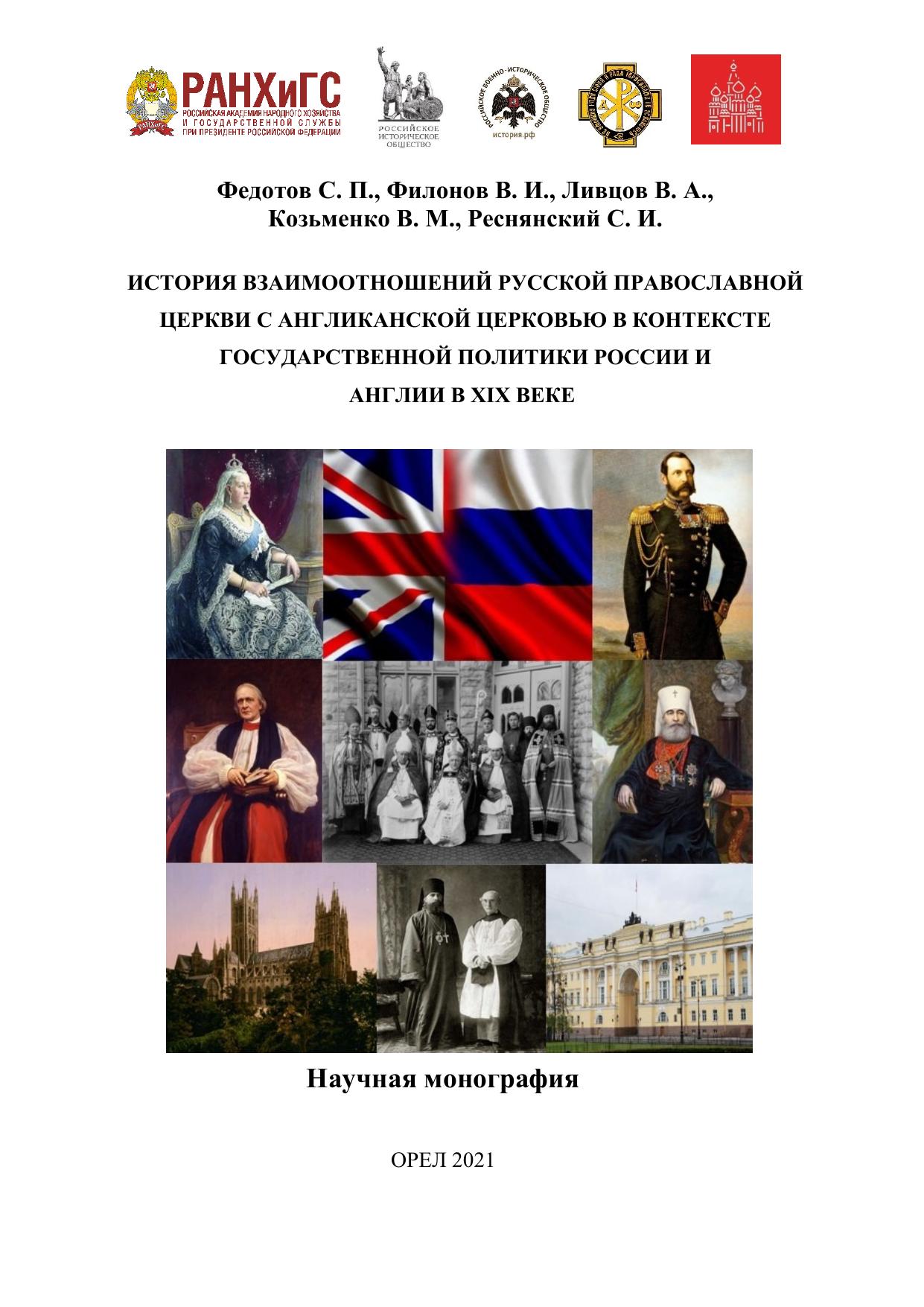 Монография представляет собой научное исследование в области государственных взаимоотношений России и Великобритании. В работе рассмотрена история развития внешнеполитического взаимодействия Российской империи и Великобритании в XIX веке в условиях диалога Русской православной церкви с Англиканской церковью. Отмечена роль церковного диалога двух церквей в построении отношений СанктПетербурга и Лондона. В научный оборот вводятся многие ранее неопубликованные уникальные архивные источники.