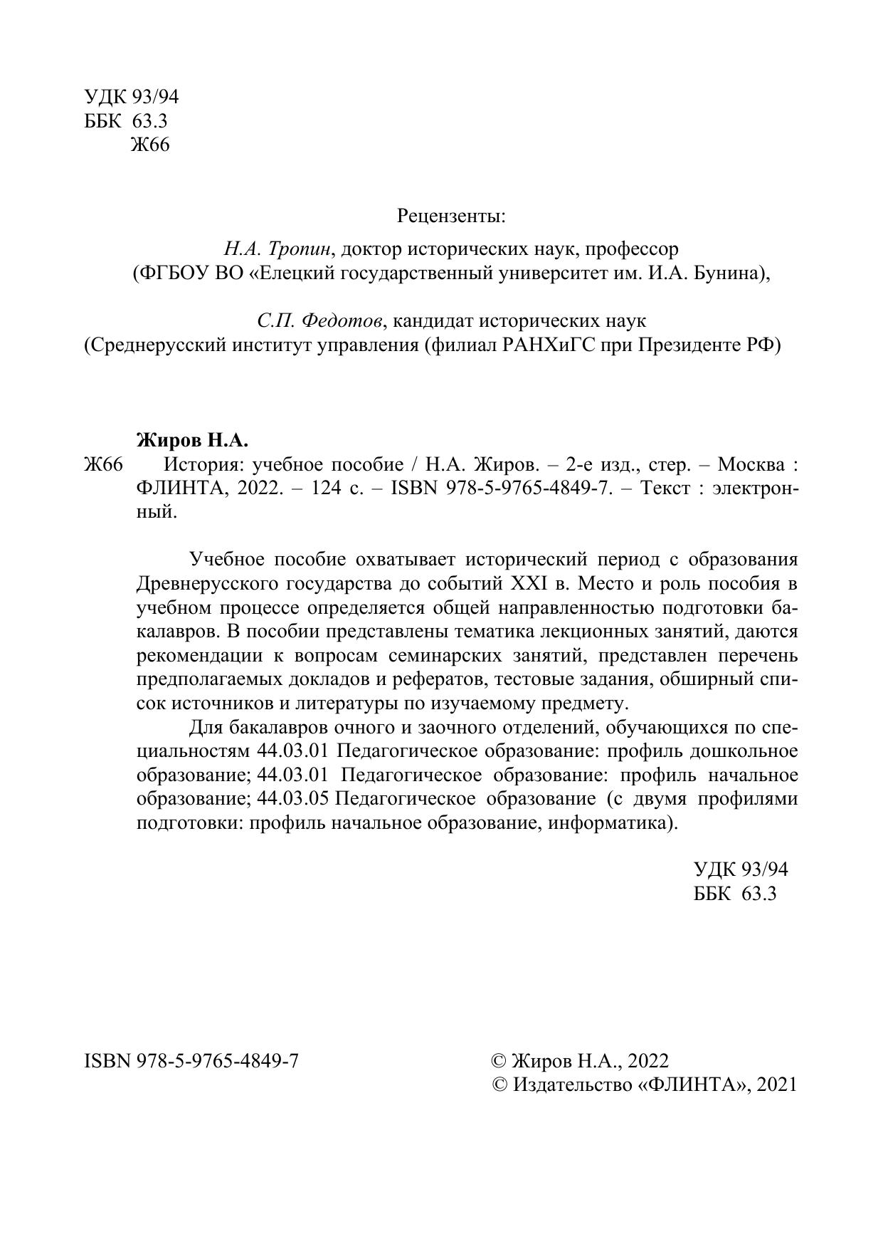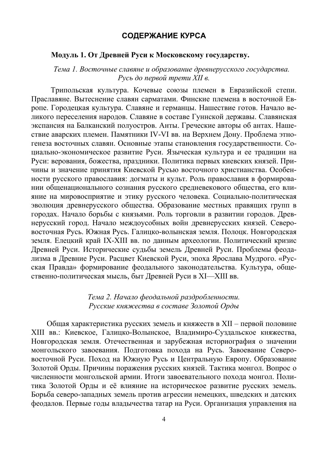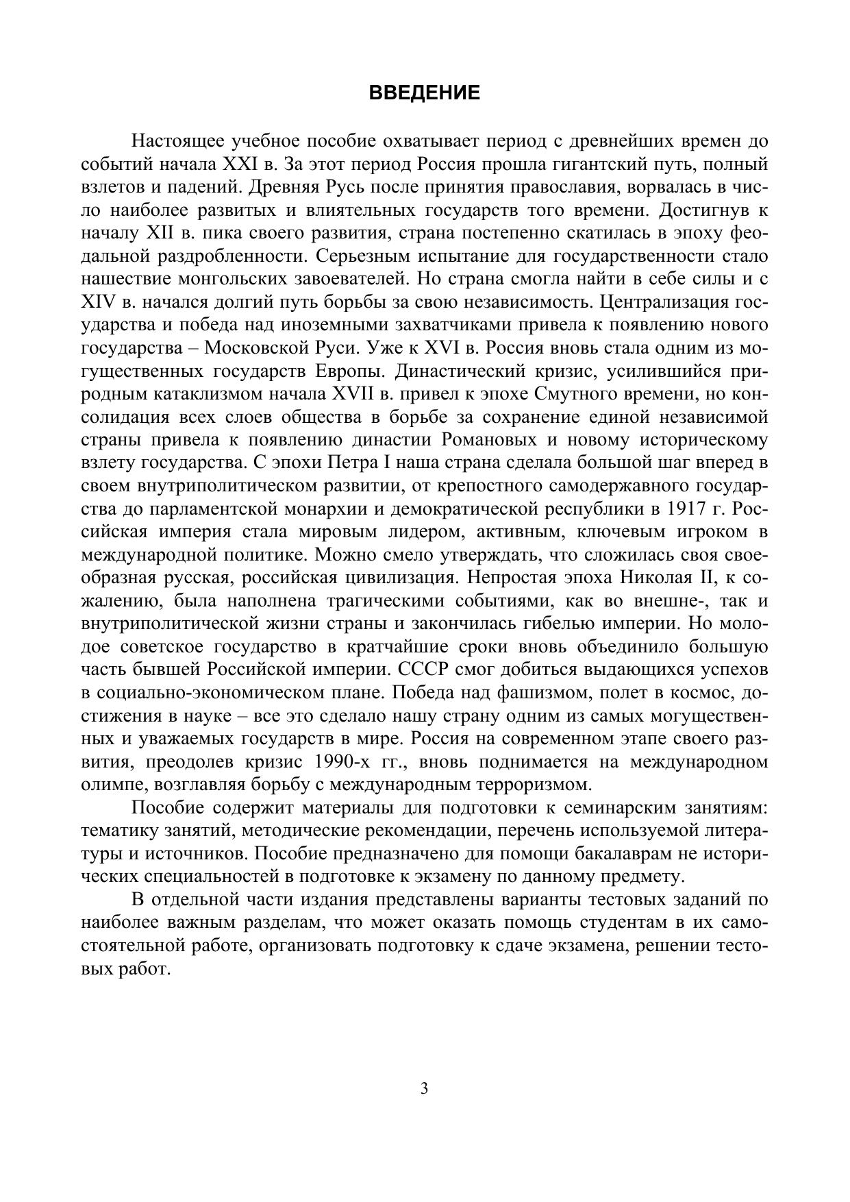 Учебное пособие охватывает исторический период с образования Древнерусского государства до событий ХXI в. Место и роль пособия в учебном процессе определяется общей направленностью подготовки бакалавров. В пособии представлены тематика лекционных занятий, даются рекомендации к вопросам семинарских занятий, представлен перечень предполагаемых докладов и рефератов, тестовые задания, обширный список источников и литературы по изучаемому предмету.