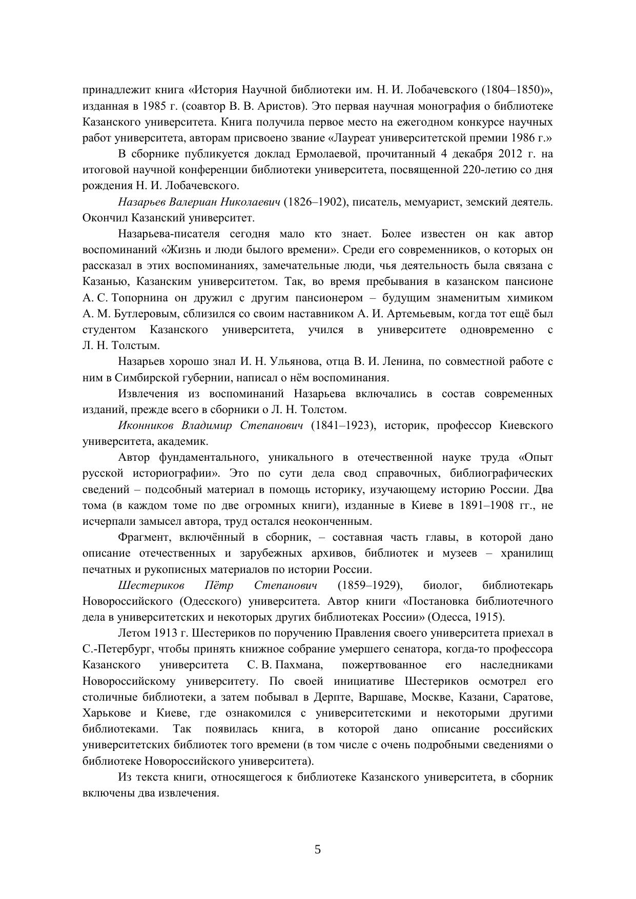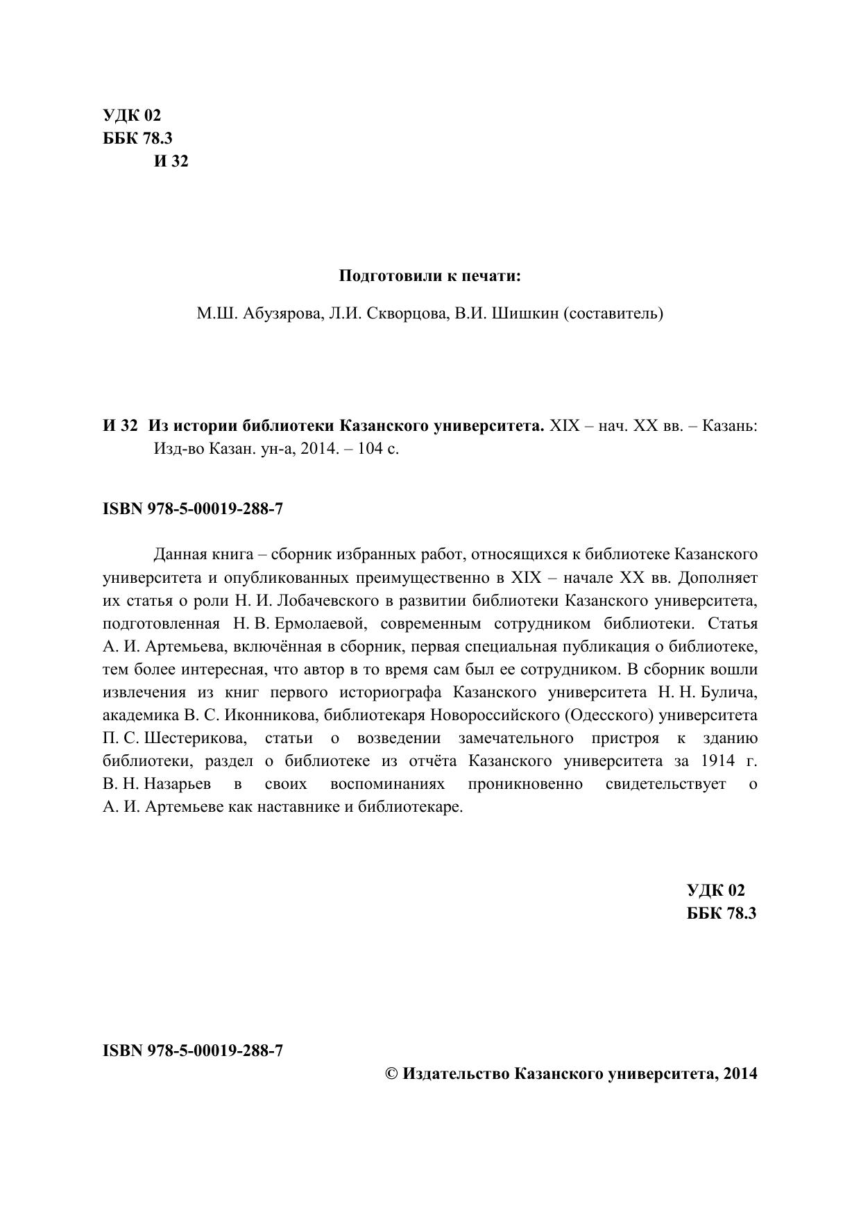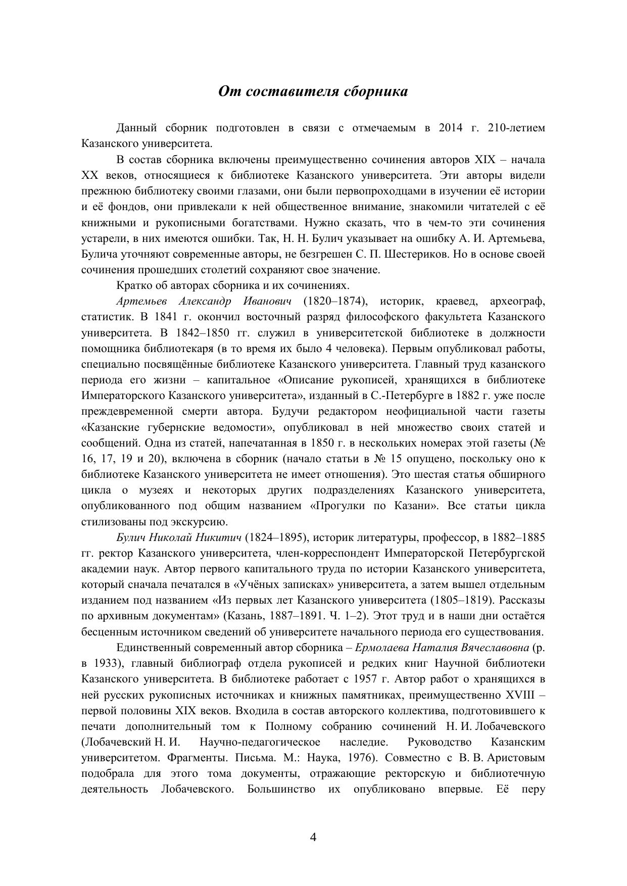 подготовленная Н. В. Ермолаевой, современным сотрудником библиотеки. Статья А. И. Артемьева, включённая в сборник, первая специальная публикация о библиотеке, тем более интересная, что автор в то время сам был ее сотрудником. В сборник вошли извлечения из книг первого историографа Казанского университета Н. Н. Булича, академика В. С. Иконникова, библиотекаря Новороссийского (Одесского) университета П. С. Шестерикова, статьи о возведении замечательного пристроя к зданию библиотеки, раздел о библиотеке из отчёта Казанского университета за 1914 г. В. Н. Назарьев в своих воспоминаниях проникновенно свидетельствует о А. И. Артемьеве как наставнике и библиотекаре.