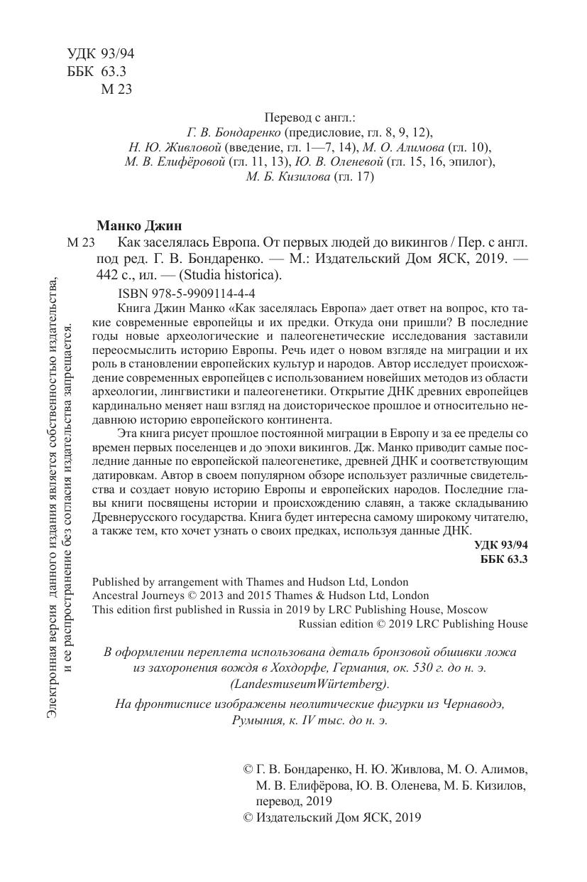 Книга Джин Манко «Как заселялась Европа» дает ответ на вопрос, кто такие современные европейцы и их предки. Откуда они пришли? В последние годы новые археологические и палеогенетические исследования заставили переосмыслить историю Европы. Речь идет о новом взгляде на миграции и их роль в становлении европейских культур и народов. Автор исследует происхождение современных европейцев с использованием новейших методов из области археологии, лингвистики и палеогенетики. Открытие ДНК древних европейцев кардинально меняет наш взгляд на доисторическое прошлое и относительно недавнюю историю европейского континента. Эта книга рисует прошлое постоянной миграции в Европу и за ее пределы со времен первых поселенцев и до эпохи викингов. Дж. Манко приводит самые последние данные по европейской палеогенетике, древней ДНК и соответствующим датировкам. Автор в своем популярном обзоре использует различные свидетельства и создает новую историю Европы и европейских народов. Последние главы книги посвящены истории и происхождению славян, а также складыванию Древнерусского государства. Книга будет интересна самому широкому читателю, а также тем, кто хочет узнать о своих предках, используя данные ДНК.