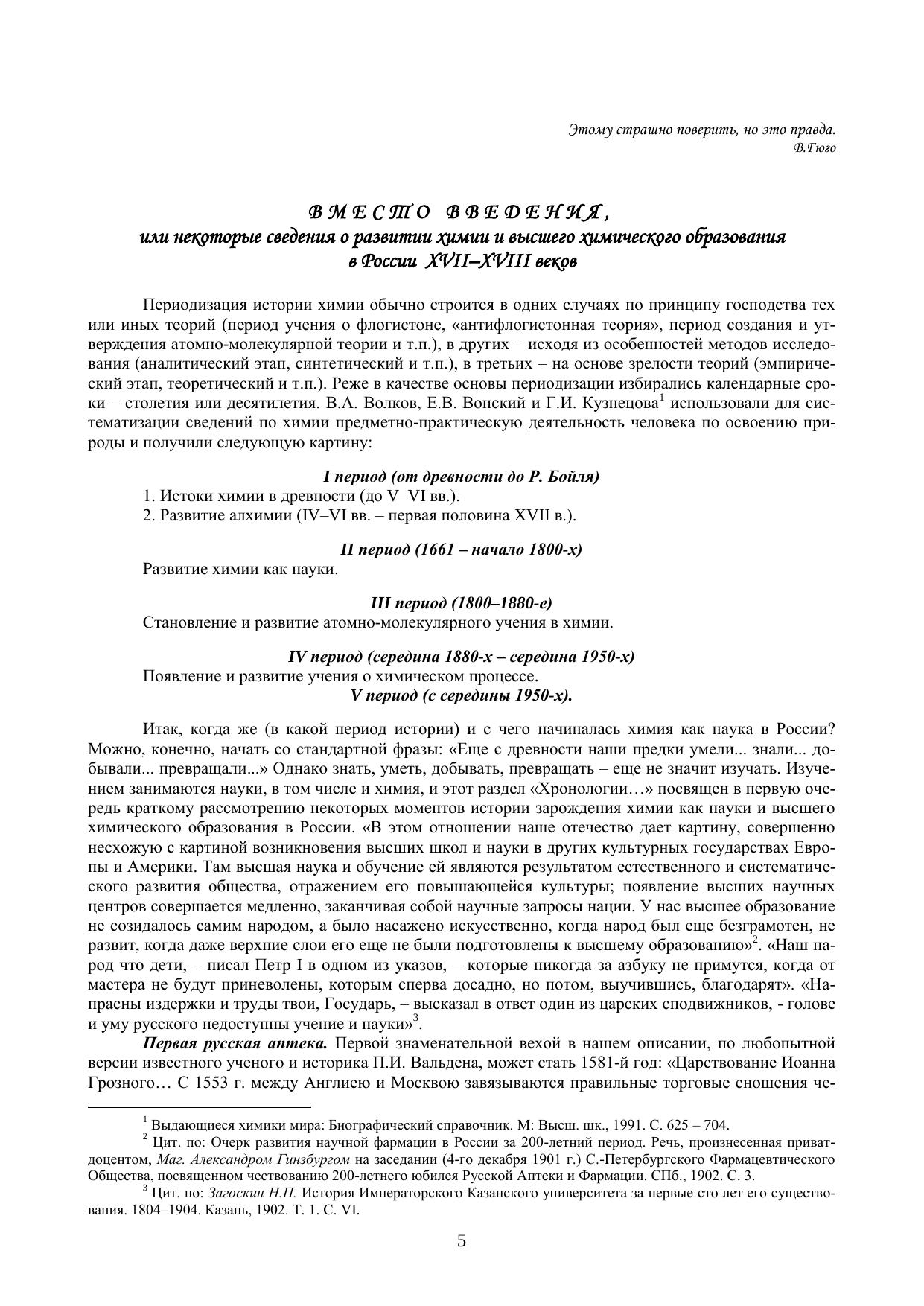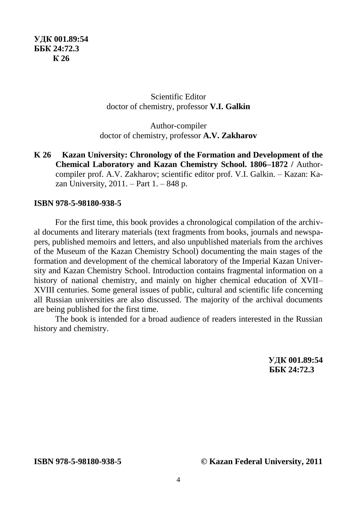 Впервые в хронологической последовательности приведены архивные документы, литературные материалы (фрагменты текстов из книг, журналов и газет, опубликованных воспоминаний, писем, а также черновиков неизданного фонда Музея Казанской химической школы), раскрывающие основные этапы зарождения и становления химической лаборатории Императорского Казанского университета и Казанской химической школы. Во введении представлены отрывочные сведения по истории отечественной химии, в основном высшего химического образования XVII–XVIII вв. Рассмотрены также и некоторые общие для всех университетов России проблемы общественной, культурной и научной жизни. Большая часть архивных документов публикуется впервые. Книга рассчитана на широкий круг читателей, интересующихся отечественной историей и химией.