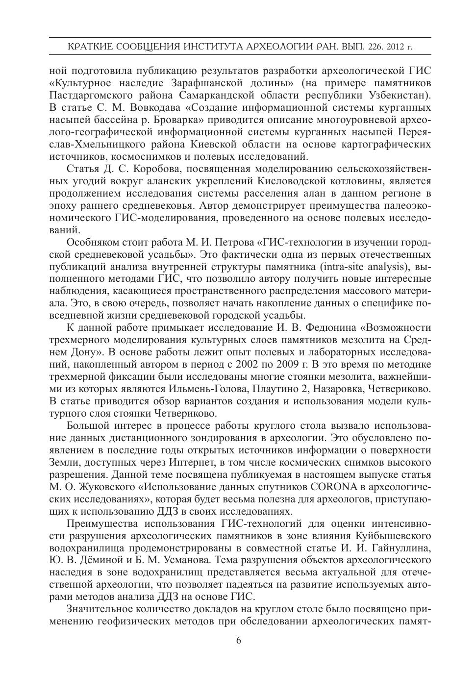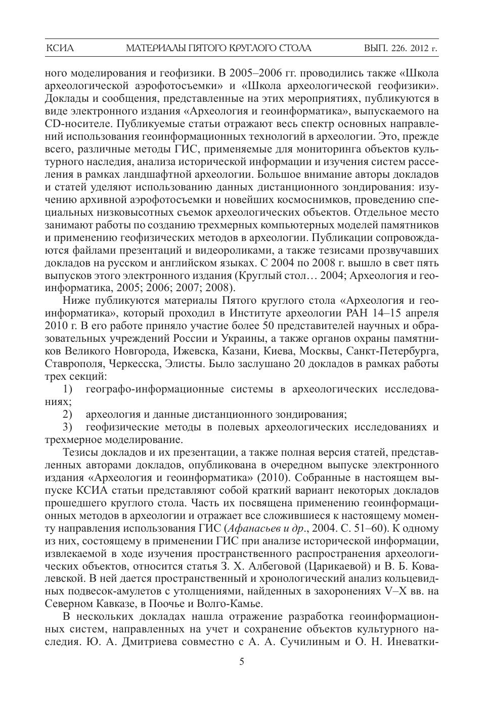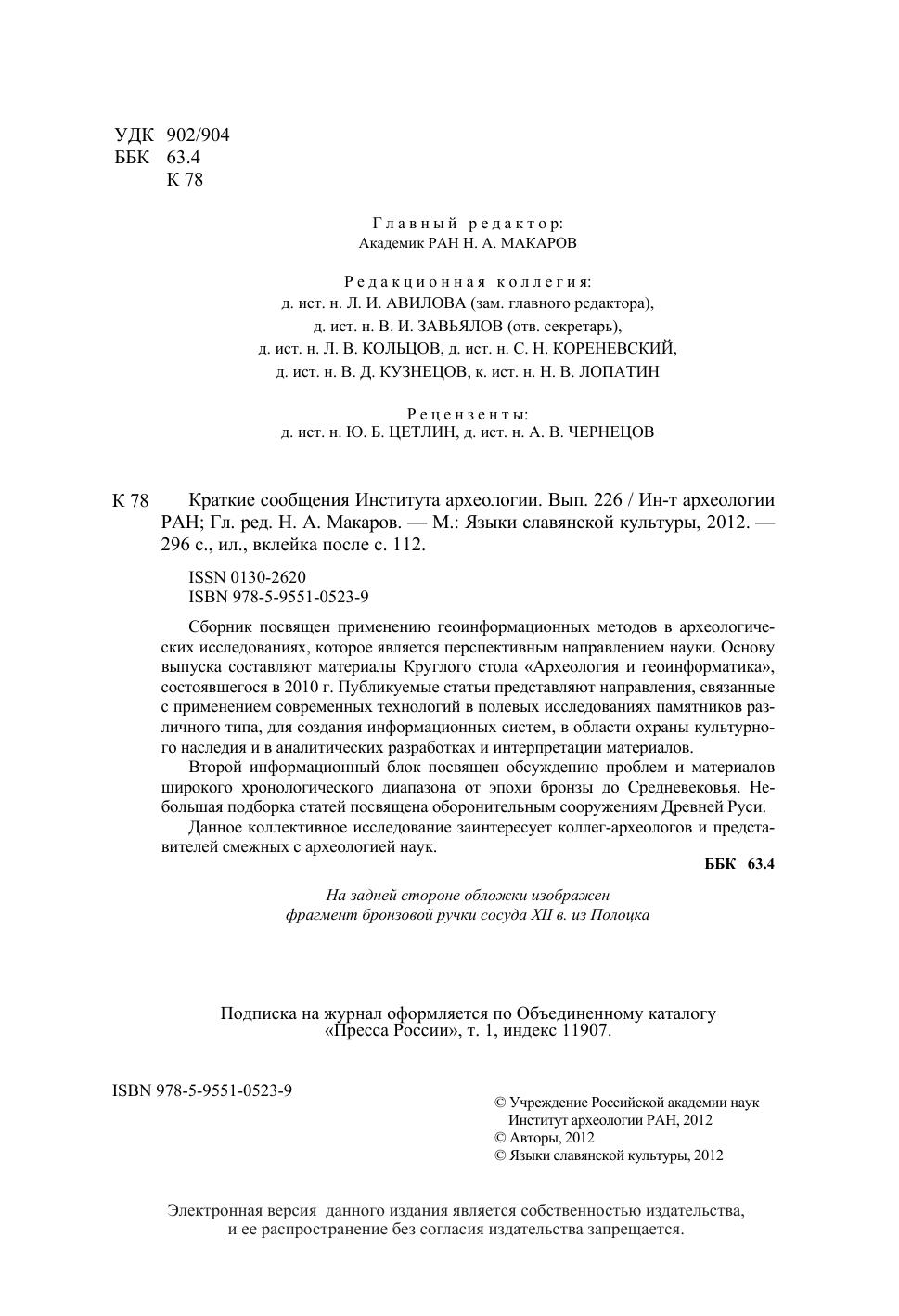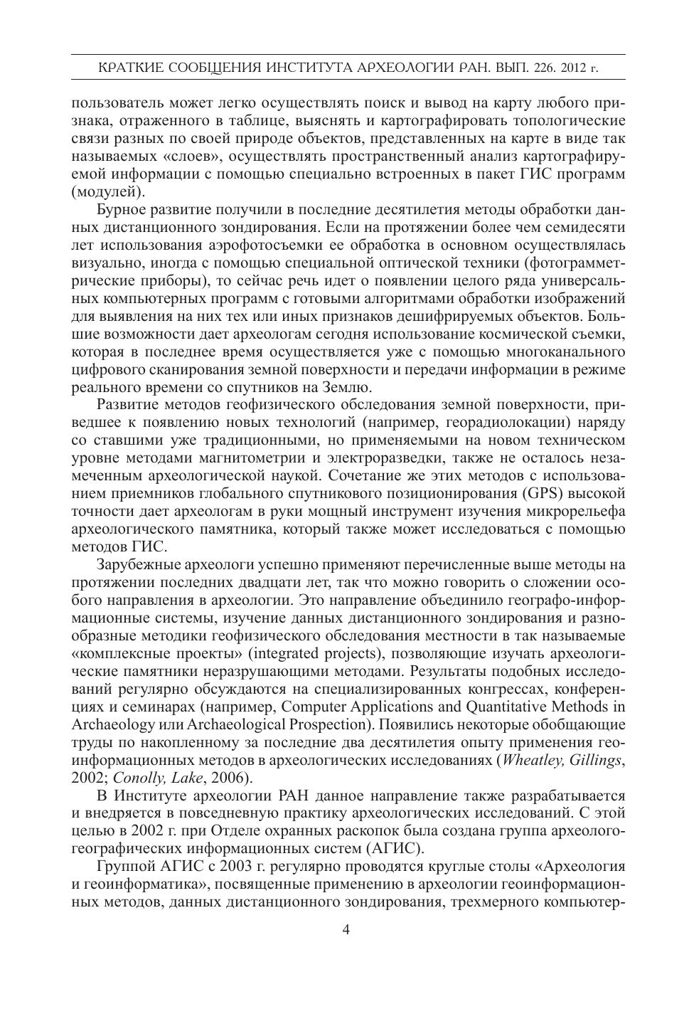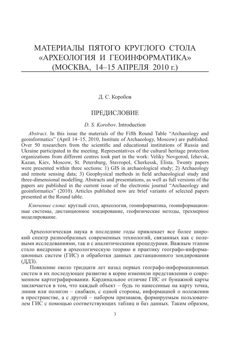 Сборник посвящен применению геоинформационных методов в археологических исследованиях, которое является перспективным направлением науки. Основу выпуска составляют материалы Круглого стола "Археология и геоинформатика", состоявшегося в 2010 г. Публикуемые статьи представляют направления, связанные с применением современных технологий в полевых исследованиях памятников различного типа, для создания информационных систем, в области охраны культурного наследия и в аналитических разработках и интерпретации материалов. Второй информационный блок посвящен обсуждению проблем и материалов широкого хронологического диапазона от эпохи бронзы до Средневековья. Небольшая подборка статей посвящена оборонительным сооружениям Древней Руси. Данное коллективное исследование заинтересует коллег-археологов и представителей смежных с археологией наук.