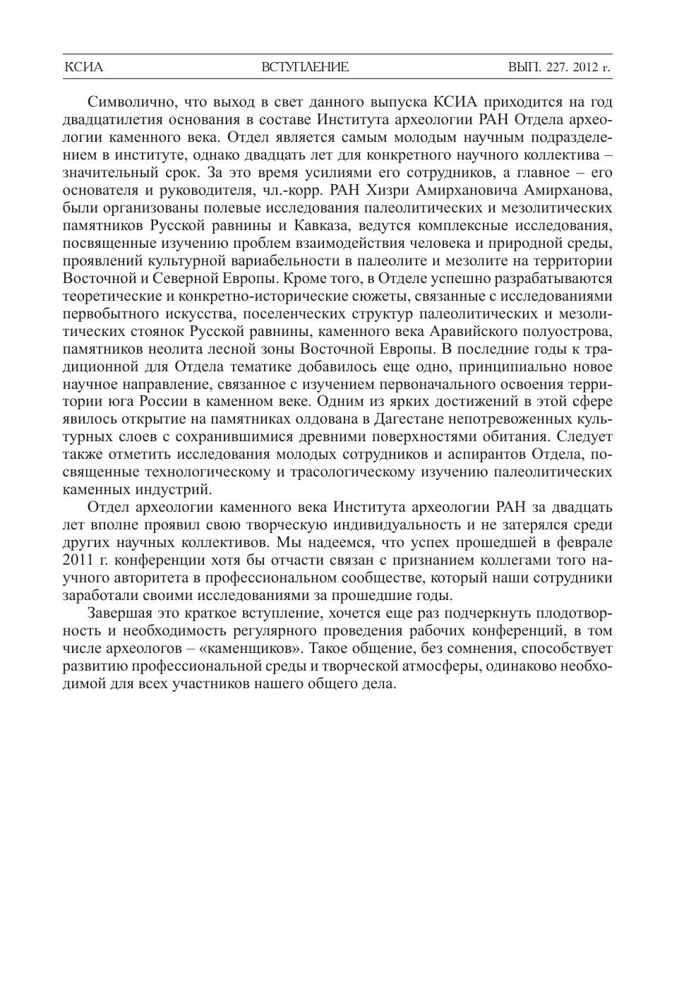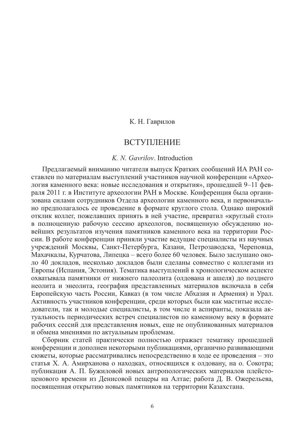 Предлагаемый читателю выпуск Кратких сообщений ИА РАН полностью состоит из материалов научной конференции "Археология каменного века: новые исследования и открытия", прошедшей 9-11 февраля 2011 г. в Институте археологии РАН. Конференция была посвящена обсуждению новейших результатов изучения памятников каменного века на территории России и за ее пределами. Публикуемые материалы охватывают протяженный отрезок времени - от нижнего палеолита (олдована и ашеля) до позднего неолита и энеолита, географический диапазон исследований включает Европейскую часть России, Кавказ и Урал. Выход в свет данного выпуска приходится на год двадцатилетия основания в составе Института археологии РАН Отдела археологии каменного века и отражает результаты, достигнутые специалистами в области исследования древнейшего периода истории человечества.