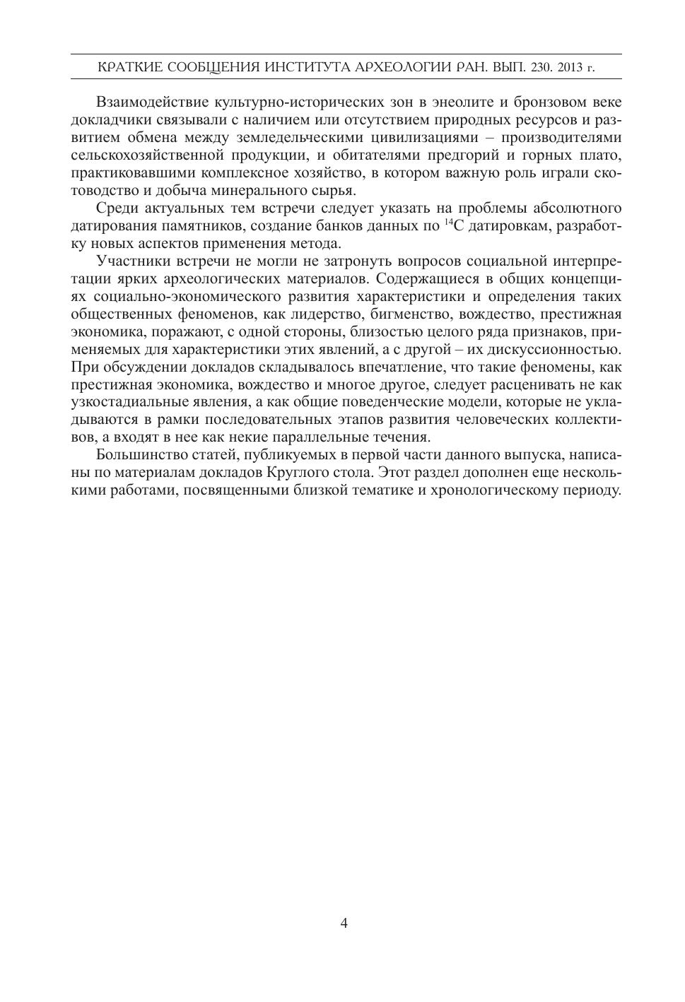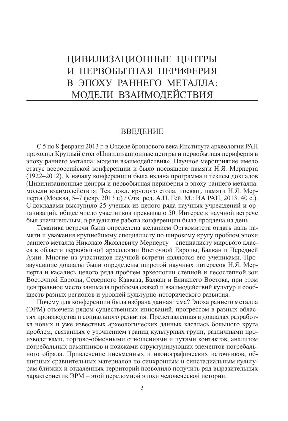 Настоящий выпуск издания включает публикацию материалов Круглого стола «Цивилизационные центры и первобытная периферия в эпоху раннего металла: модели взаимодействия». Эта Всероссийская конференция прошла в феврале 2013 г. в Отделе бронзового века Института археологии РАН и была посвящена памяти Н.Я. Мерперта (1922-2012). Публикуемые статьи освещают широкий круг проблем археологии степной и лесостепной зон Восточной Европы, Северного Кавказа, Балкан и Ближнего Востока. Особое внимание уделяется взаимодействию культур и сообществ разных регионов и уровней культурно-исторического развития в энеолите и бронзовом веке, в том числе обмену между земледельческими цивилизациями и обитателями предгорий, практиковавшими комплексное хозяйство. Среди актуальных тем - вопросы абсолютного датирования памятников и разработка новых аспектов применения метода. Второй информационный блок посвящен обсуждению проблем и публикации новых материалов широкого хронологического диапазона от каменного века до средневековья. Данное коллективное исследование заинтересует коллег-археологов и представителей смежных с археологией наук.