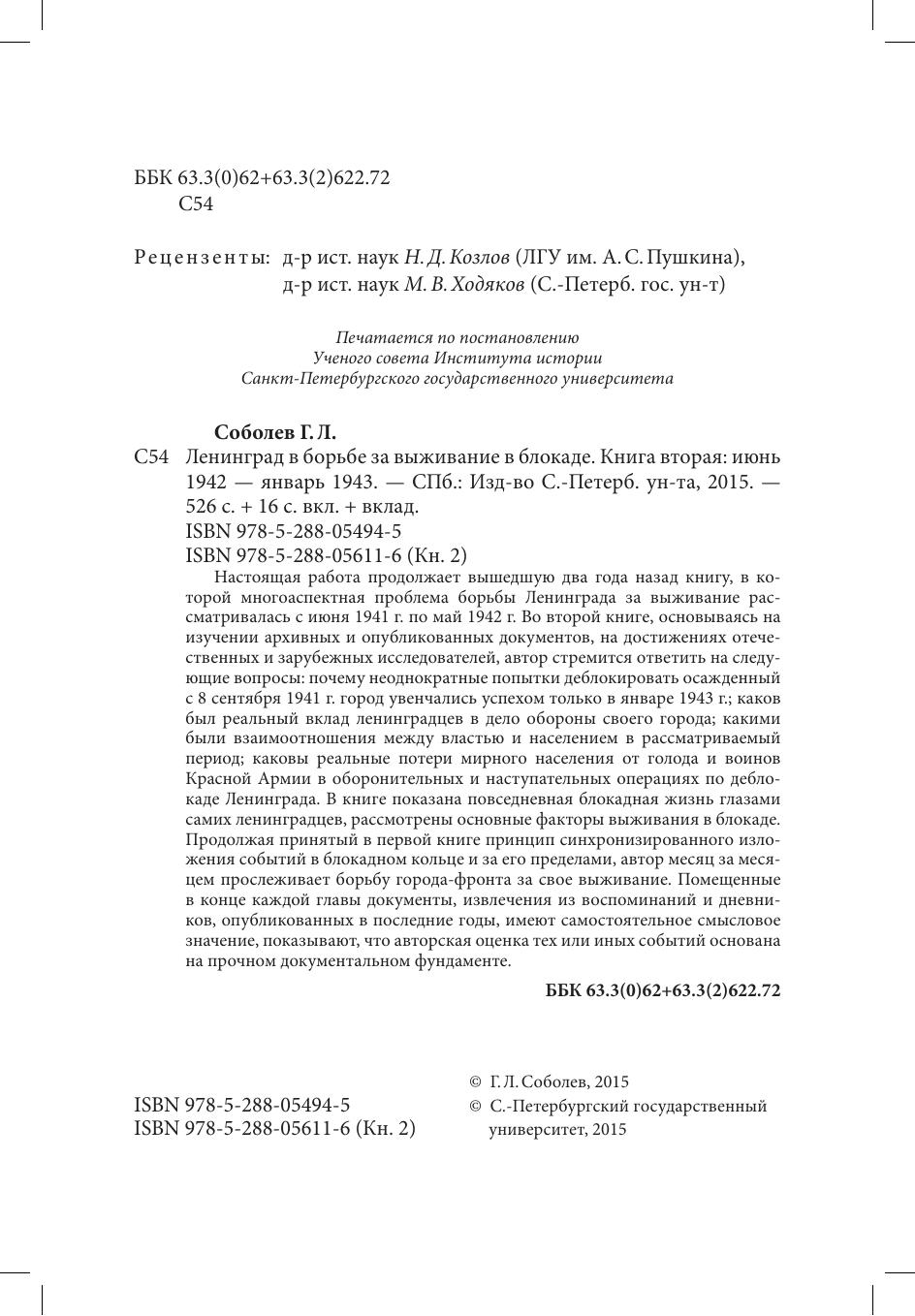 Настоящая работа продолжает вышедшую два года назад книгу, в которой многоаспектная проблема борьбы Ленинграда за выживание рассматривалась с июня 1941 г. по май 1942 г. Во второй книге, основываясь на изучении архивных и опубликованных документов, на достижениях отечественных и зарубежных исследователей, автор стремится ответить на следующие вопросы: почему неоднократные попытки деблокировать осажденный с 8 сентября 1941 г. город увенчались успехом только в январе 1943 г.; каков был реальный вклад ленинградцев в дело обороны своего города; какими были взаимоотношения между властью и населением в рассматриваемый период; каковы реальные потери мирного населения от голода и воинов Красной Армии в оборонительных и наступательных операциях по деблокаде Ленинграда. В книге показана повседневная блокадная жизнь глазами самих ленинградцев, рассмотрены основные факторы выживания в блокаде. Продолжая принятый в первой книге принцип синхронизированного изло- жения событий в блокадном кольце и за его пределами, автор месяц за месяцем прослеживает борьбу города-фронта за свое выживание. Помещенные в конце каждой главы документы, извлечения из воспоминаний и дневников, опубликованных в последние годы, имеют самостоятельное смысловое значение, показывают, что авторская оценка тех или иных событий основана на прочном документальном фундаменте.