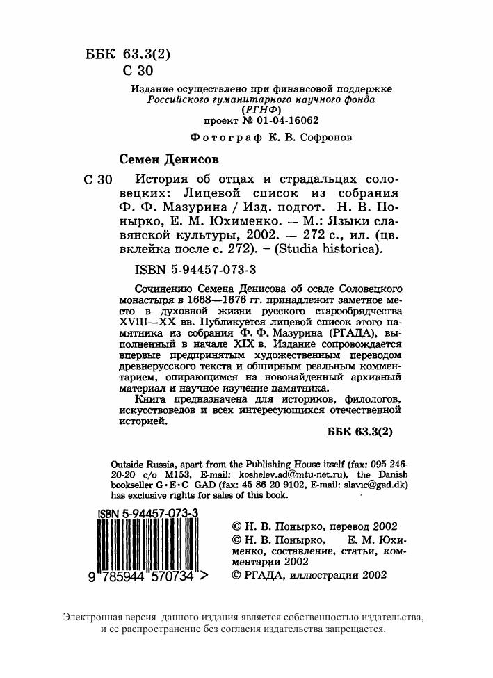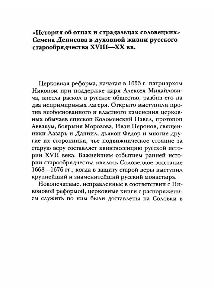 Сочинению Семена Денисова об осаде Соловецкого монастыря в 1668-1676 гг. принадлежит заметное место в духовной жизни русского старообрядчества ХVIII-XX вв. Публикуется лицевой список этого памятника из собрания Ф.Ф. Мазурина (РГАДА), выполненный в начале XIX в. Издание сопровождается впервые предпринятым художественным переводом древнерусского текста и обширным реальным комментарием, опирающимся на новонайденный архивный материал и научное изучение памятника. Книга предназначена для историков, филологов, искусствоведов и всех интересующихся отечественной историей.