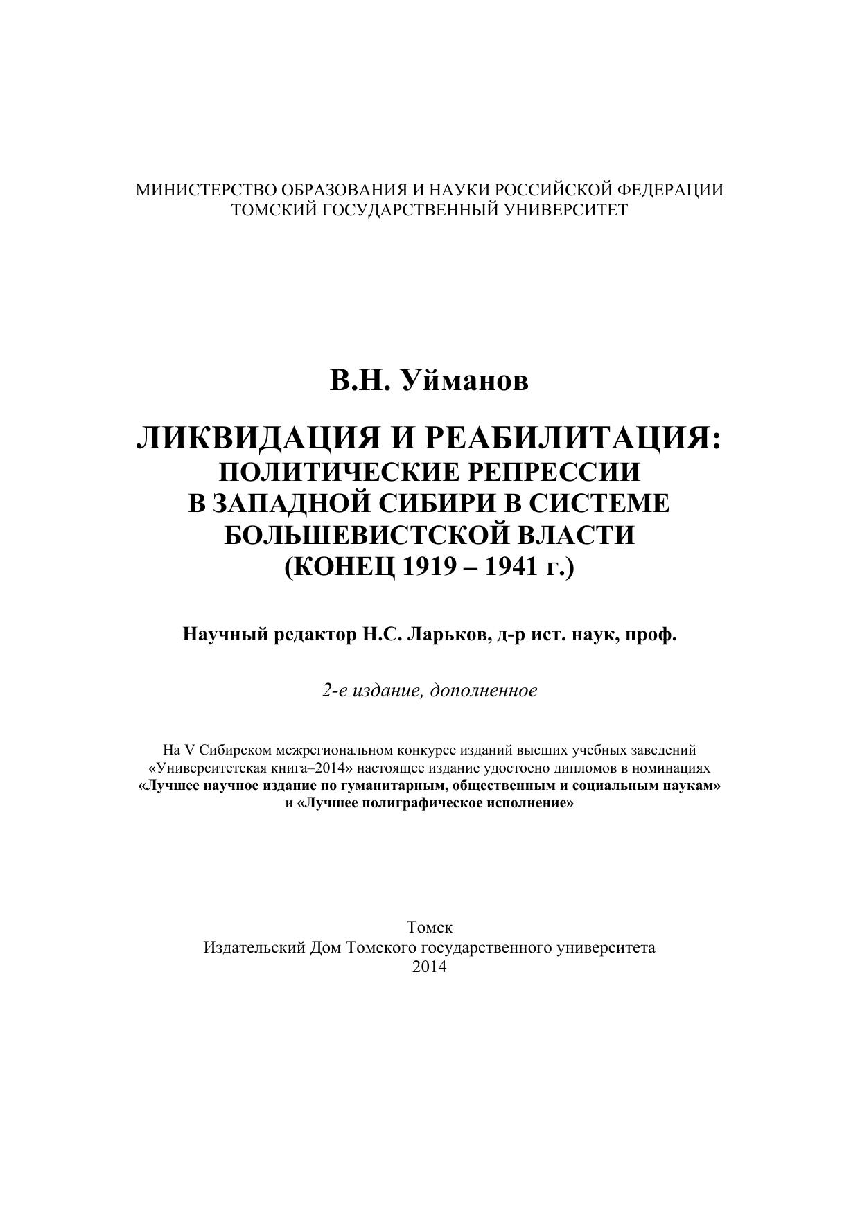 Ликвидация и реабилитация: Политические репрессии в Западной Сибири в системе большевистской власти (конец 1919 – 1941 г.)