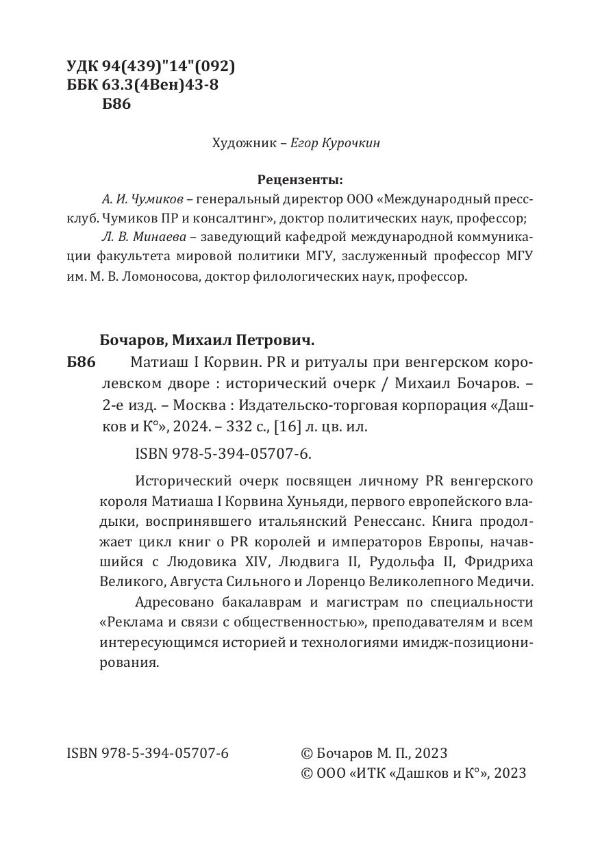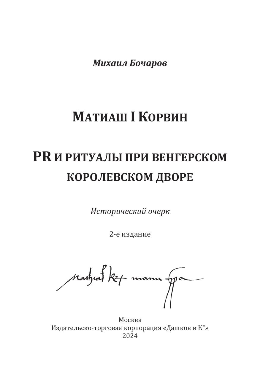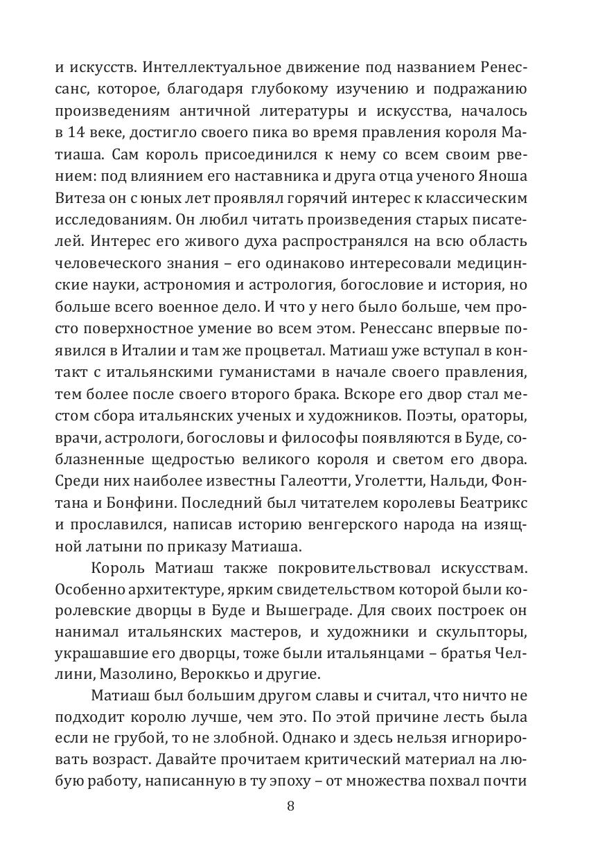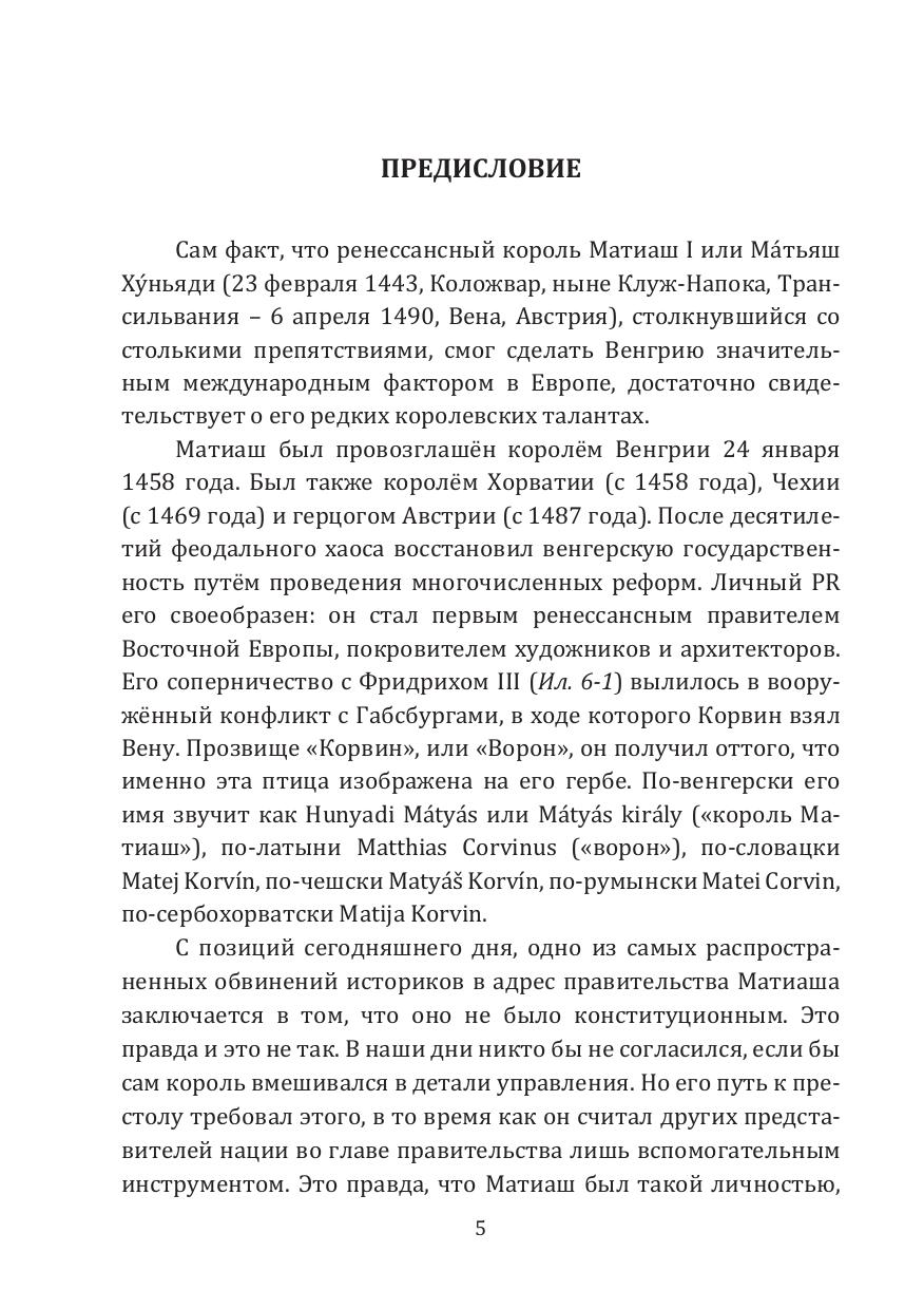 Исторический очерк посвящен личному PR венгерского короля Матиаша I Корвина Хуньяди, первого европейского владыки, воспринявшего итальянский Ренессанс. Книга продолжает цикл книг о PR королей и императоров Европы, начавшийся с Людовика XIV, Людвига II, Рудольфа II, Фридриха Великого, Августа Сильного и Лоренцо Великолепного Медичи.