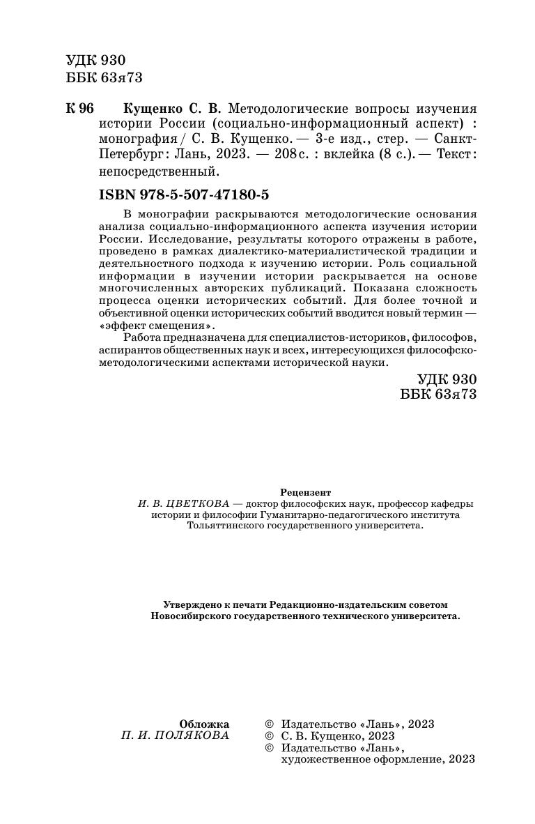 В монографии раскрываются методологические основания анализа социально-информационного аспекта изучения истории России. Исследование, результаты которого отражены в работе, проведено в рамках диалектико-материалистической традиции и деятельностного подхода к изучению истории. Роль социальной информации в изучении истории раскрывается на основе многочисленных авторских публикаций. Показана сложность процесса оценки исторических событий. Для более точной и объективной оценки исторических событий вводится новый термин — «эффект смещения». Работа предназначена для специалистов-историков, философов, аспирантов общественных наук и всех, интересующихся философско-методологическими аспектами исторической науки. Утверждено к печати Редакционно-издательским советом Новосибирского государственного технического университета.