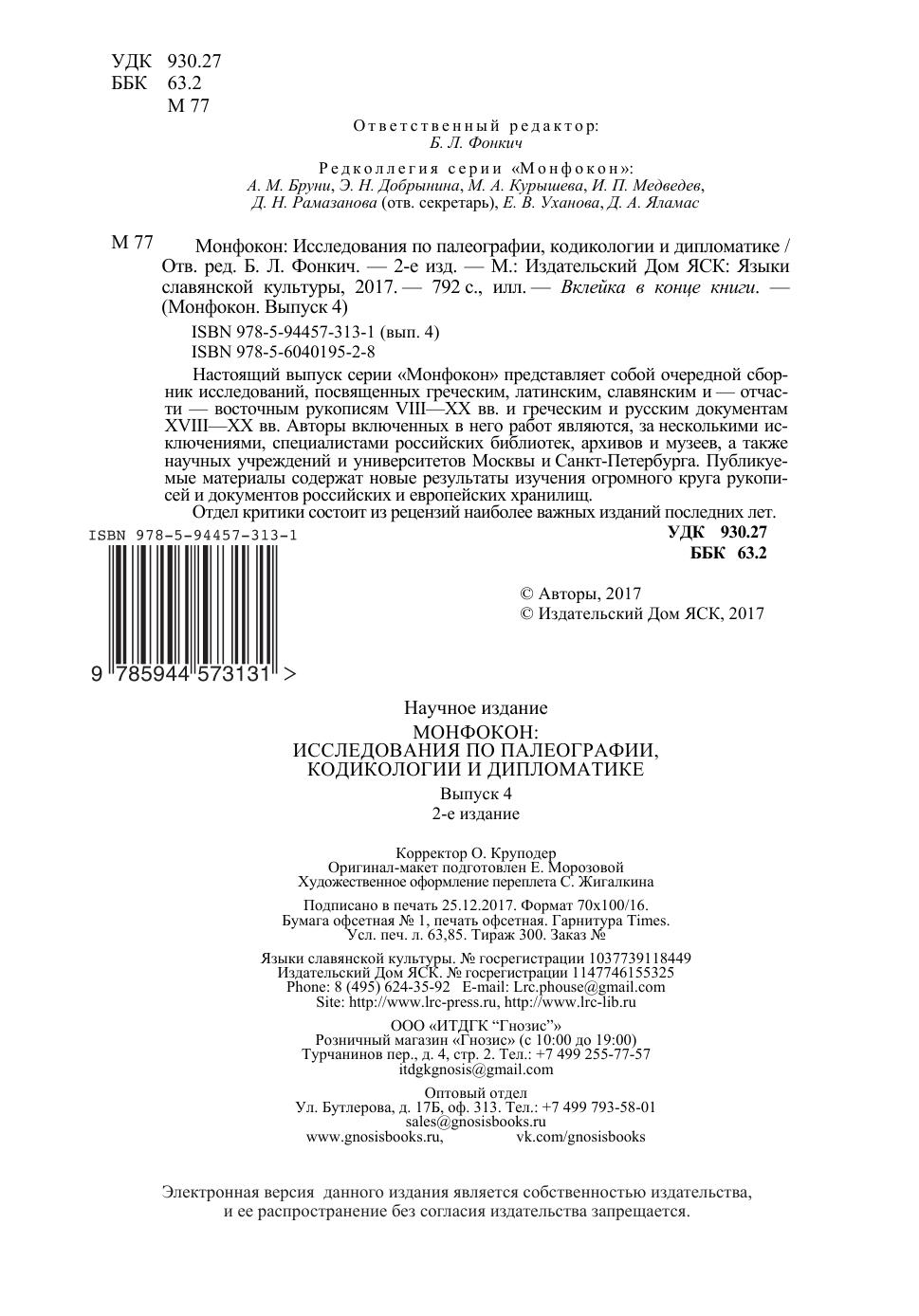 Настоящий выпукс серии "Монфокон" представляет собой очередной сборник исследований, посвященных греческим, латинским, славянским и – отчасти – восточным рукописям VIII-XX вв. и греческим и русским документам XVIII-XX вв. Публикуемые материалы содержат новые результаты изучения огромного круга рукописей и документов российских и европейских хранилищ.