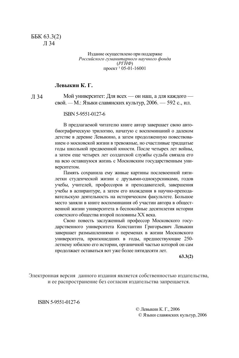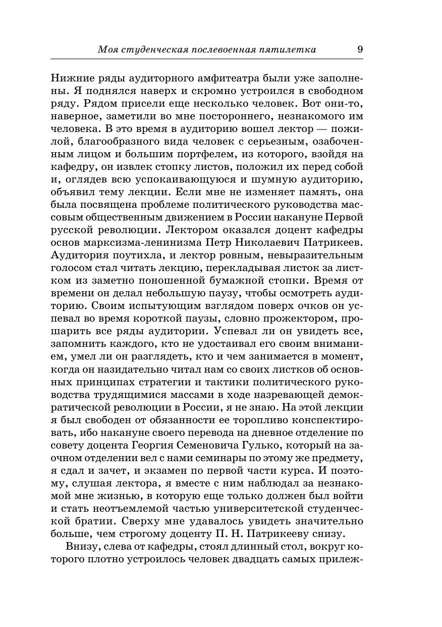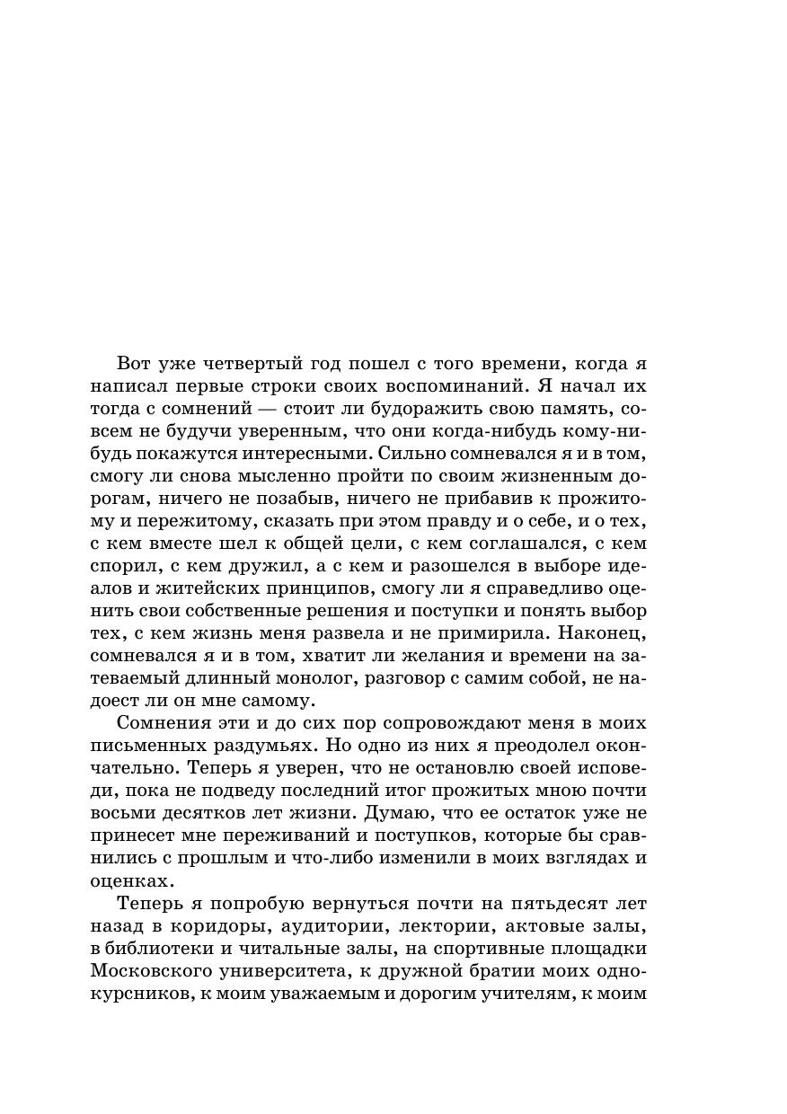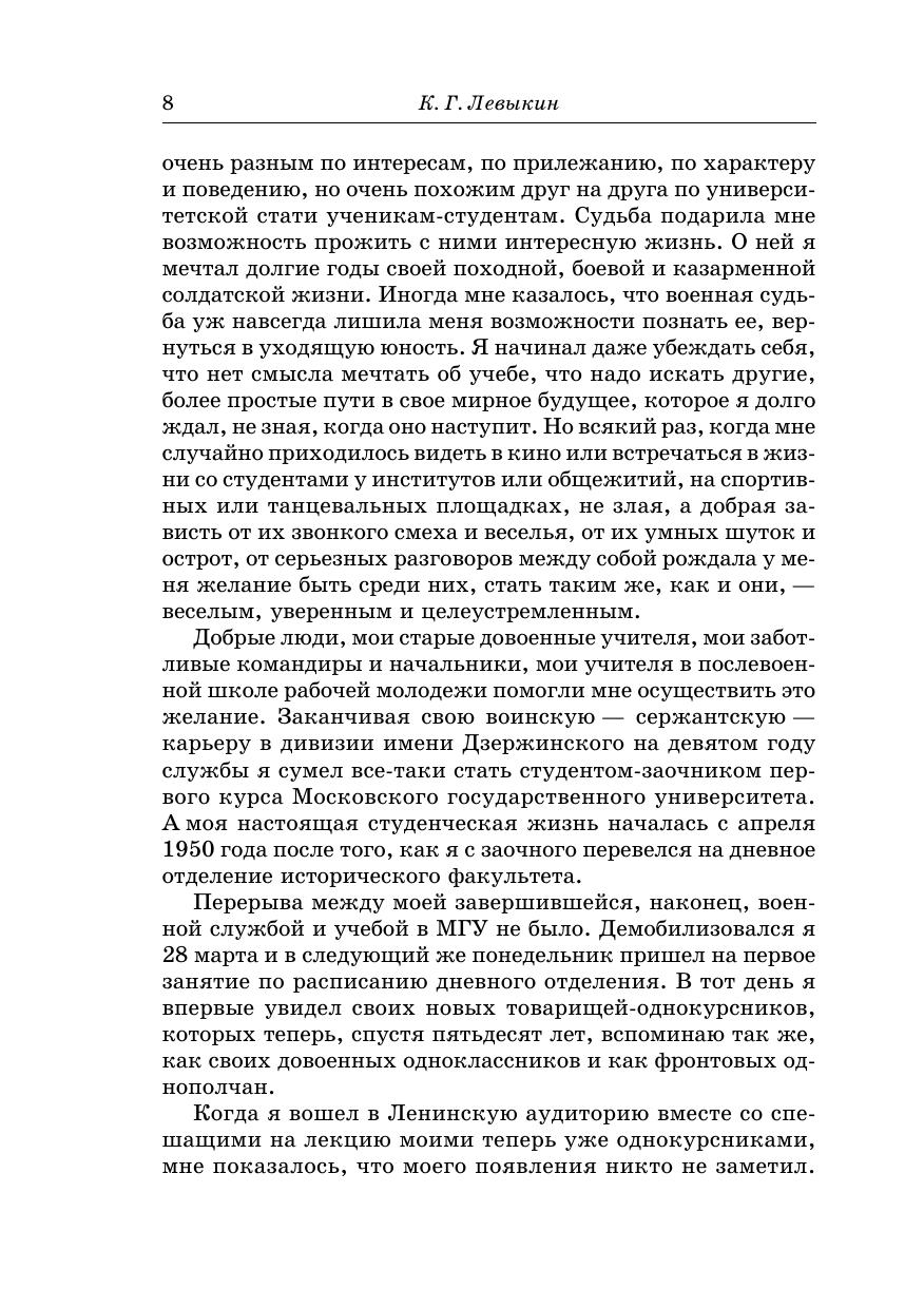 В предлагаемой читателю книге автор завершает свою автобиографическую трилогию, начатую с воспоминаний о далеком детстве в деревне Левыкино, а затем продолженную повествованием о московской жизни в тревожные, но счастливые тридцатые годы школьной предвоенной юности. После четырех лет войны, а затем еще четырех лет солдатской службы судьба связала его на всю оставшуюся жизнь с Московским государственным университетом. Память сохранила ему живые картины послевоенной пятилетки студенческой жизни с друзьями-однокурсниками, годов учебы, учителей, профессоров и преподавателей, завершения учебы в аспирантуре, а затем его вхождения в научно-преподавательскую деятельность на историческом факультете. Большое место заняли в книге воспоминания об участии автора в общественной жизни университета в беспокойные десятилетия истории советского общества второй половины XX века. Свою повесть заслуженный профессор Московского государственного университета Константин Григорьевич Левыкин завершает размышлениями о переменах в жизни Московского университета, произошедших в годы, предшествующие 250-летнему юбилею его истории, органичной частью которой он сам продолжает оставаться вот уже более пятидесяти лет.