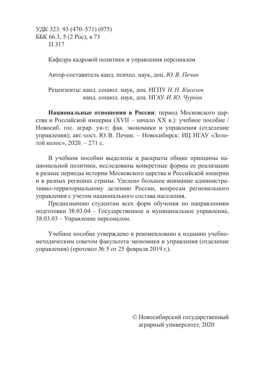 В учебном пособии выделены и раскрыты общие принципы национальной политики, исследованы конкретные формы ее реализации в разные периоды истории Московского царства и Российской империи и в разных регионах страны. Уделено большое внимание административно-территориальному делению России, вопросам регионального управления с учетом национального состава населения. Предназначено студентам всех форм обучения по направлениям подготовки 38.03.04 – Государственное и муниципальное управление, 38.03.03 – Управление персоналом. Учебное пособие утверждено и рекомендовано к изданию учебно-методическим советом факультета экономики и управления (отделение управления) (протокол № 5 от 25 февраля 2019 г.).