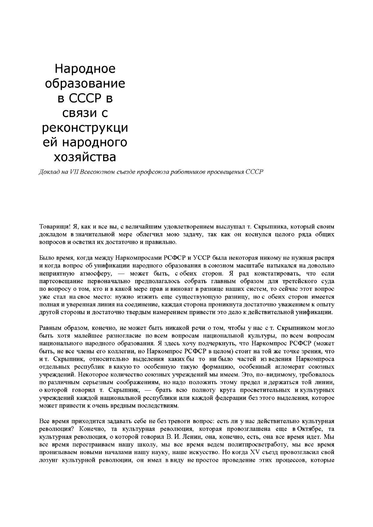 Народное образование в СССР в связи с реконструкцией народного хозяйства. Доклады на VII съезде Союза работников просвещения