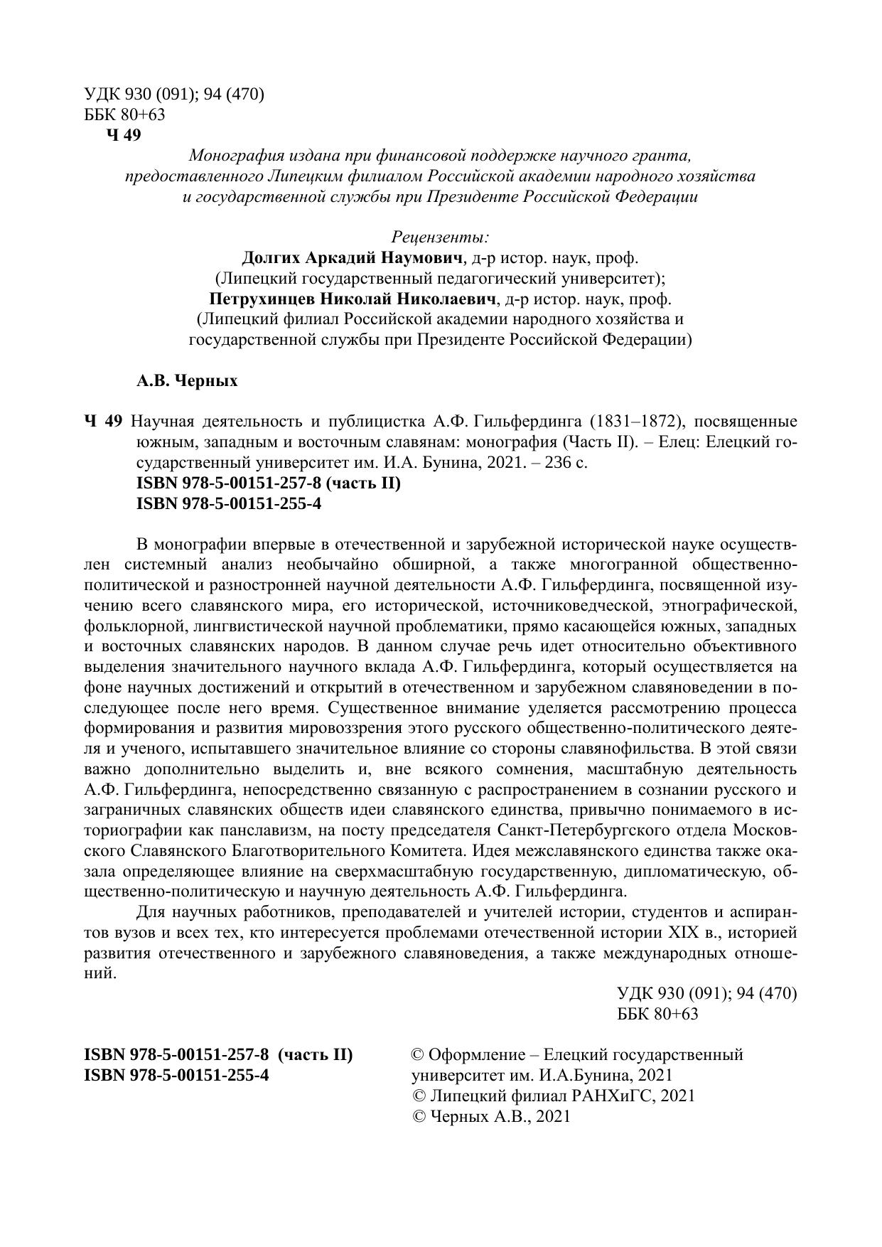 В монографии впервые в отечественной и зарубежной исторической науке осуществ-лен системный анализ необычайно обширной, а также многогранной общественно-политической и разностронней научной деятельности А.Ф. Гильфердинга, посвященной изу-чению всего славянского мира, его исторической, источниковедческой, этнографической, фольклорной, лингвистической научной проблематики, прямо касающейся южных, западных и восточных славянских народов. В данном случае речь идет относительно объективного выделения значительного научного вклада А.Ф. Гильфердинга, который осуществляется на фоне научных достижений и открытий в отечественном и зарубежном славяноведении в по-следующее после него время. Существенное внимание уделяется рассмотрению процесса формирования и развития мировоззрения этого русского общественно-политического деяте-ля и ученого, испытавшего значительное влияние со стороны славянофильства. В этой связи важно дополнительно выделить и, вне всякого сомнения, масштабную деятельность А.Ф. Гильфердинга, непосредственно связанную с распространением в сознании русского и заграничных славянских обществ идеи славянского единства, привычно понимаемого в ис-ториографии как панславизм, на посту председателя Санкт-Петербургского отдела Москов-ского Славянского Благотворительного Комитета. Идея межславянского единства также ока-зала определяющее влияние на сверхмасштабную государственную, дипломатическую, об-щественно-политическую и научную деятельность А.Ф. Гильфердинга. Для научных работников, преподавателей и учителей истории, студентов и аспиран-тов вузов и всех тех, кто интересуется проблемами отечественной истории XIX в., историей развития отечественного и зарубежного славяноведения, а также международных отноше-ний.