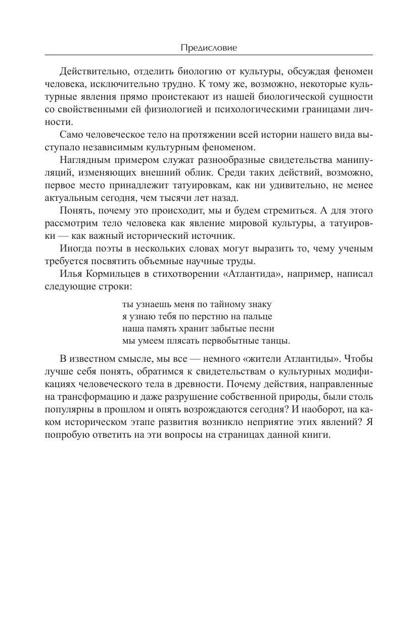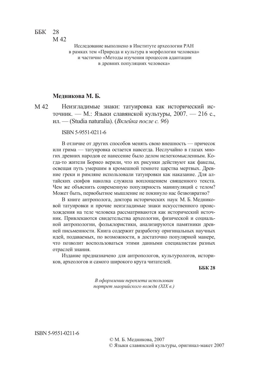 В отличие от других способов менять свою внешность — причесок или грима — татуировка остается навсегда. Неслучайно в глазах многих древних народов ее нанесение было делом нелегкомысленным. Когда-то жители Борнео верили, что их рисунки действуют как факелы, освещая путь умершим в кромешной темноте царства мертвых. Древние греки и римляне использовали татуировки как наказание. Для алтайских скифов наколка служила воплощением священного текста. Чем же объяснить современную популярность манипуляций с телом? Может быть, первобытное мышление не покинуло нас безвозвратно? В книге антрополога, доктора исторических наук М. Б. Меднико-вой татуировки и прочие неизгладимые знаки искусственного происхождения на теле человека рассматриваются как исторический источник. Привлекаются свидетельства археологии, физической и социальной антропологии, фольклористики, анализируются памятники древней письменности. Книга содержит разработку оригинальных научных идей, подаваемых, по возможности, в достаточно популярной манере, что позволит воспользоваться этими данными специалистам разных отраслей знания. Издание предназначено для антропологов, культурологов, историков, археологов и самого широкого круга читателей.