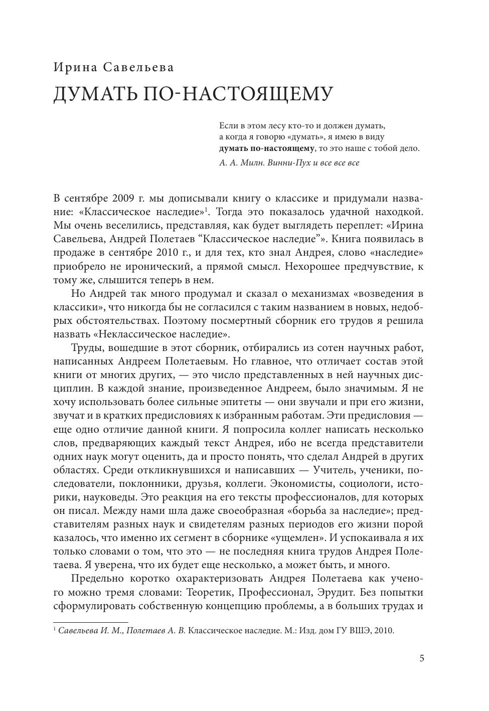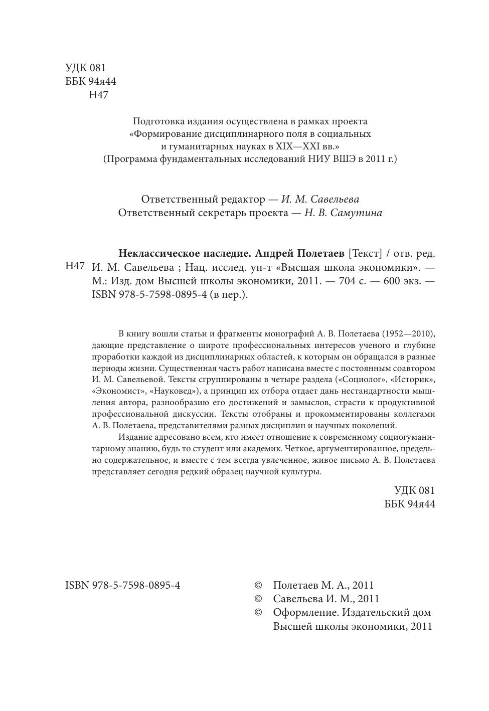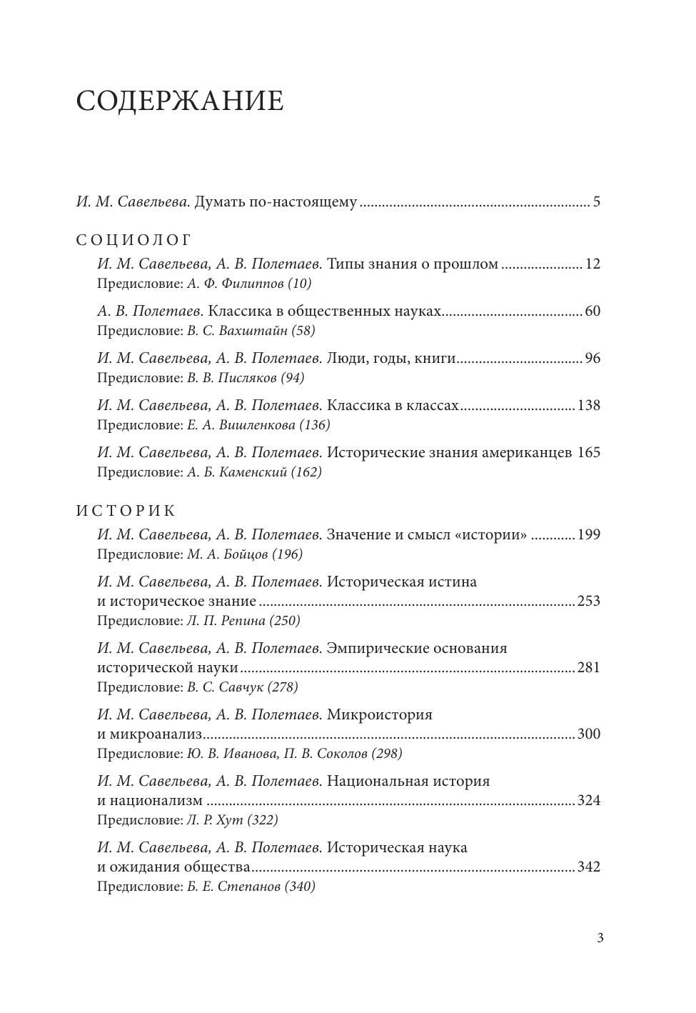 периоды жизни. Существенная часть работ написана вместе с постоянным соавтором И. М. Савельевой. Тексты сгруппированы в четыре раздела («Социолог», «Историк», «Экономист», «Науковед»), а принцип их отбора отдает дань нестандартности мышления автора, разнообразию его достижений и замыслов, страсти к продуктивной профессиональной дискуссии. Тексты отобраны и прокомментированы коллегами А. В. Полетаева, представителями разных дисциплин и научных поколений.