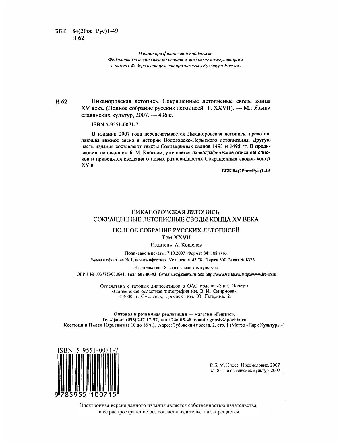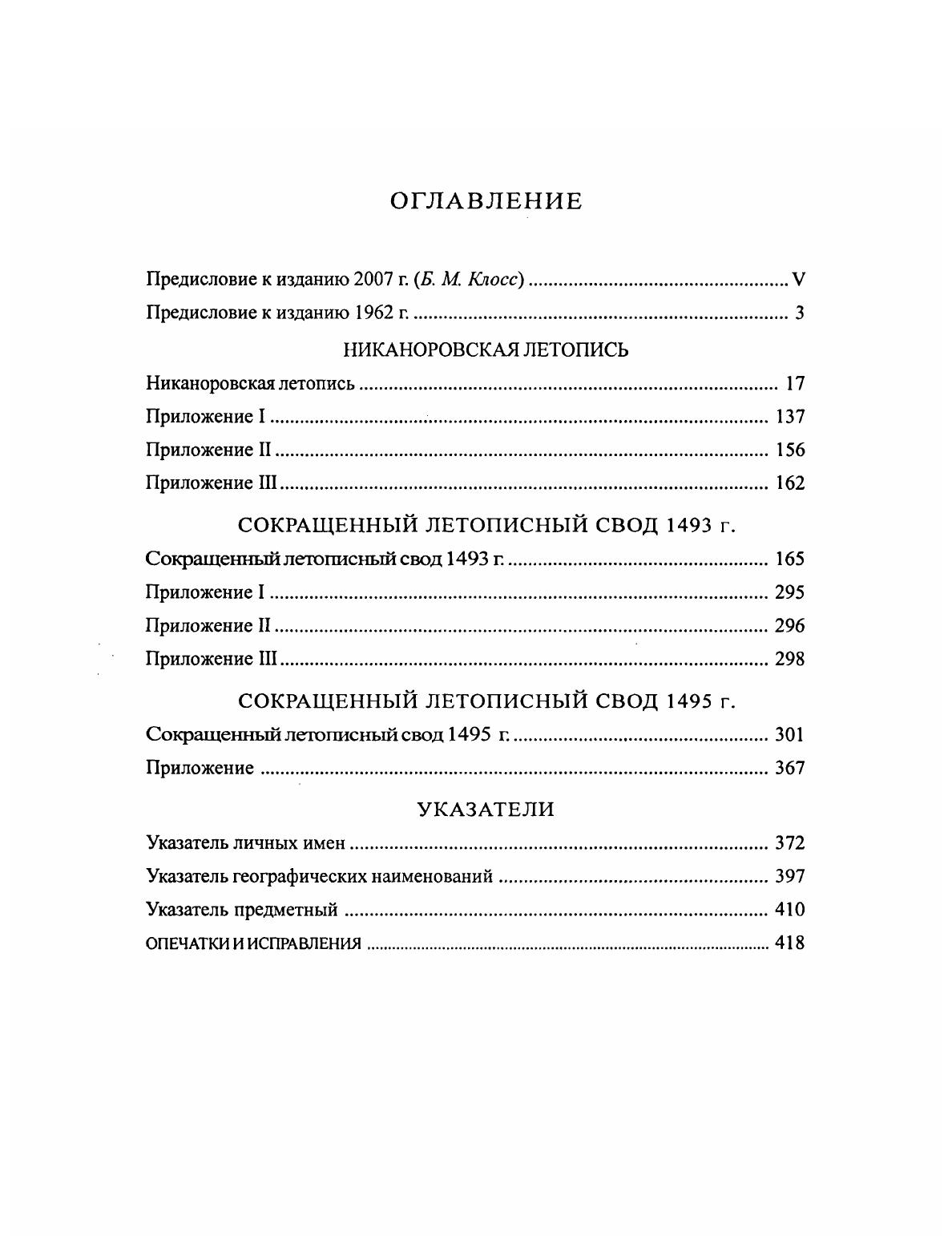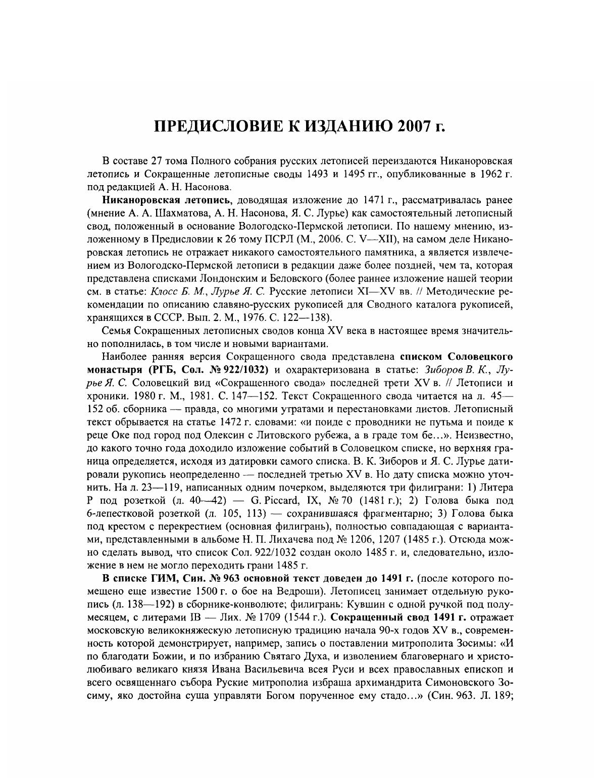 В издании 2007 года перепечатывается Никаноровская летопись, представляющая важное звено в истории Вологодско-Пермского летописания. Другую часть издания составляют тексты Сокращенных сводов 1493 и 1495 гг. В предисловии, написанном Б.М. Клоссом, уточняется палеогрфическое описание списков и приводятся сведения о новых разновидностях Сокращенных сводов конца XV в. Книга предназначена для историков, филологов и всех интересующихся древнерусской литературой и историей культуры.