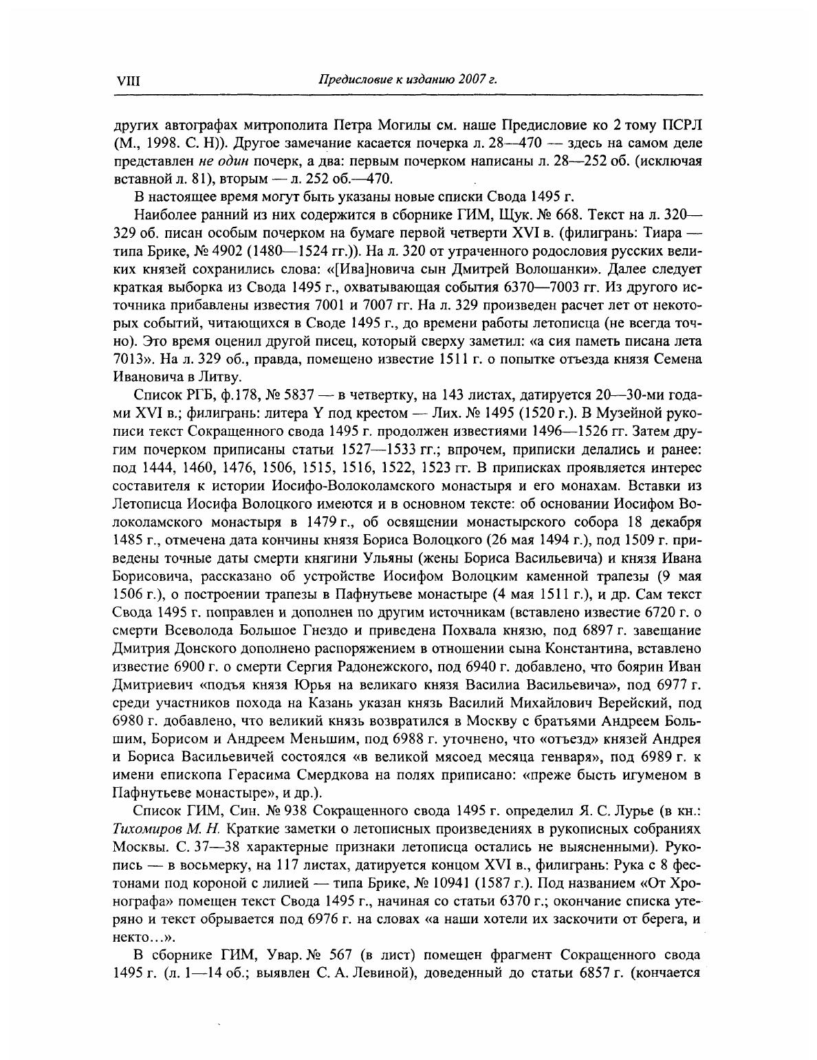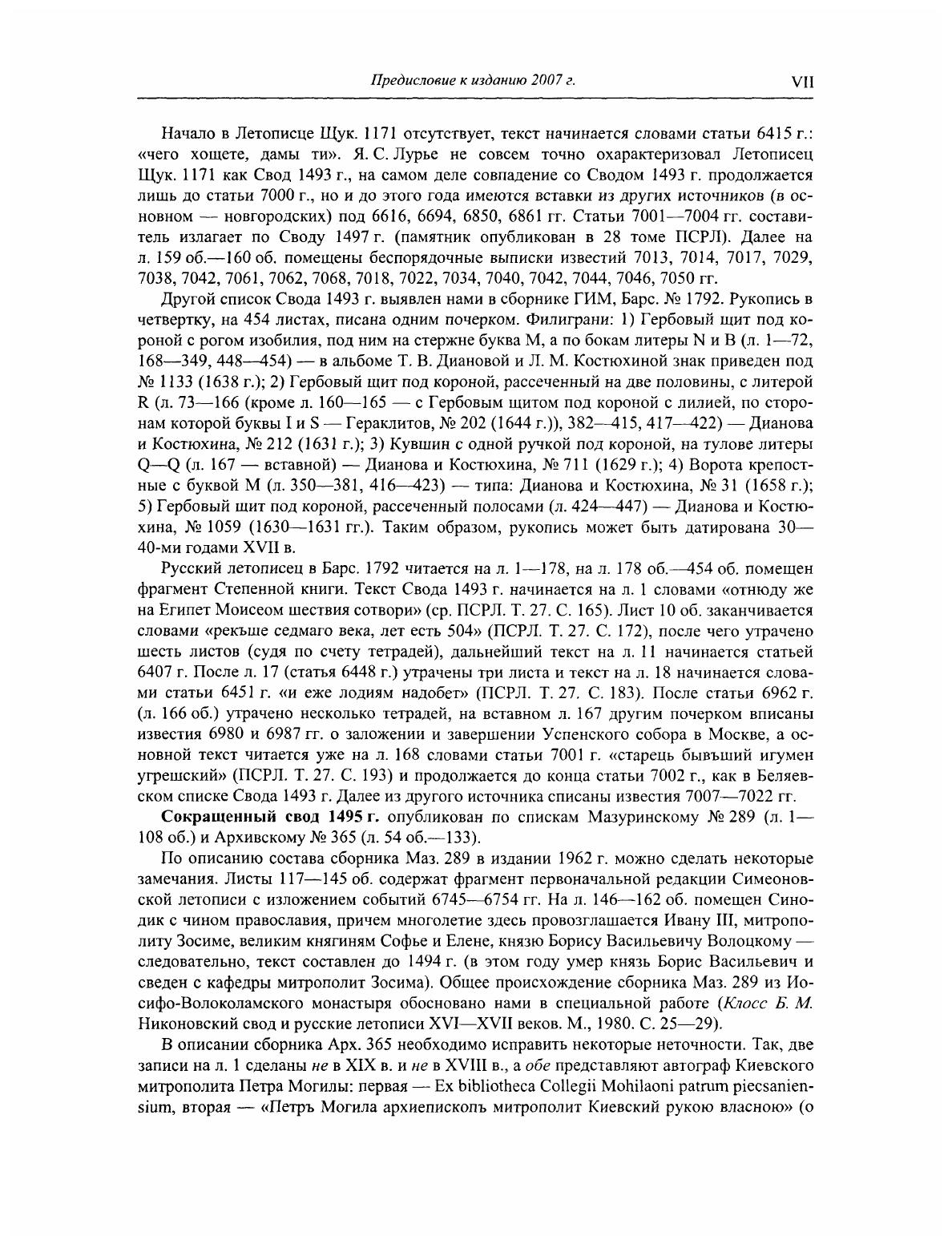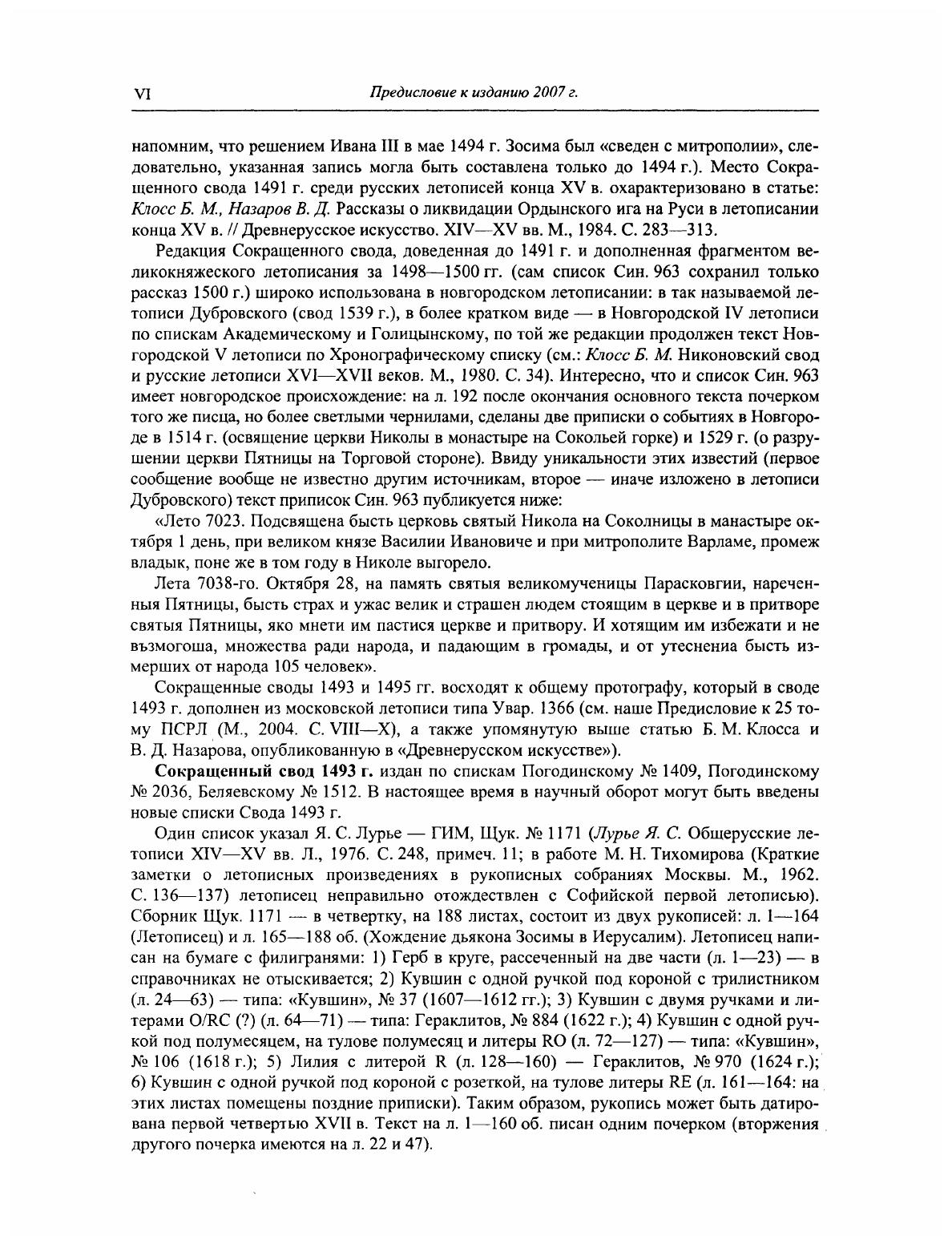 В издании 2007 года перепечатывается Никаноровская летопись, представляющая важное звено в истории Вологодско-Пермского летописания. Другую часть издания составляют тексты Сокращенных сводов 1493 и 1495 гг. В предисловии, написанном Б.М. Клоссом, уточняется палеогрфическое описание списков и приводятся сведения о новых разновидностях Сокращенных сводов конца XV в. Книга предназначена для историков, филологов и всех интересующихся древнерусской литературой и историей культуры.