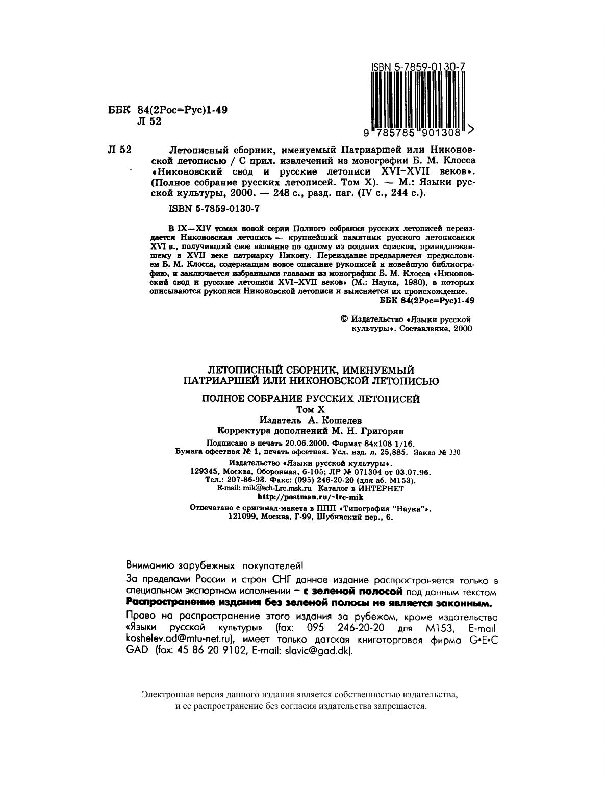 В IX-XIV томах новой серии Полного собрания русских летописей переиздается Никоновская летопись - крупнейший памятник русского летописания XVI в., получивший свое название по одному из поздних списков, принадлежавшему в XVII веке патриарху Никону. Переиздание предваряется предисловием Б.М. Клосса, содержащим новое описание рукописей и новейшую библиографию, и заключается избранными главами из монографии Б.М. Клосса «Никоновский свод и русские летописи XVI-XVII веков» (М.: Наука, 1980), в которых описываются рукописи Никоновской летописи и выясняется их происхождение. Книга предназначена для историков, филологов и всех интересующихся древнерусской литературой и историей культуры.