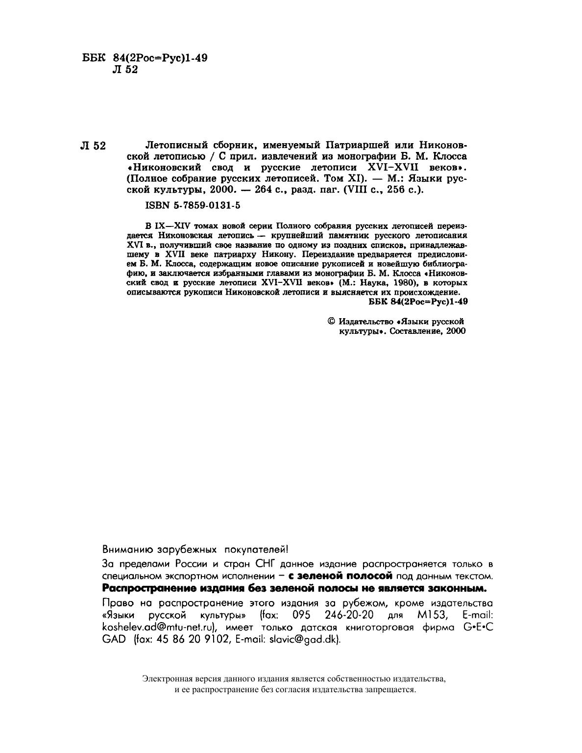 В IX-XIV томах новой серии Полного собрания русских летописей переиздается Никоновская летопись - крупнейший памятник русского летописания XVI в., получивший свое название по одному из поздних списков, принадлежавшему в XVII веке патриарху Никону. Переиздание предваряется предисловием Б.М. Клосса, содержащим новое описание рукописей и новейшую библиографию, и заключается избранными главами из монографии Б.М. Клосса «Никоновский свод и русские летописи XVI-XVII веков» (М.: Наука, 1980), в которых описываются рукописи Никоновской летописи и выясняется их происхождение. Книга предназначена для историков, филологов и всех интересующихся древнерусской литературой и историей культуры.