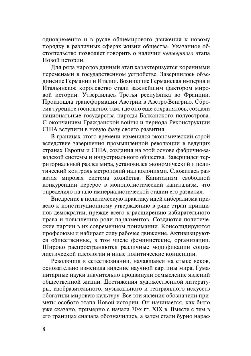 Освещаются основные вопросы истории Нового времени Европы и Северной Америки. Рассматриваются проблемы политического, социального, культурного и экономического развития указанных регионов в целом и специфика названных процессов в Великобритании, Франции, Германии, Австро-Венгрии, Италии, США. Раскрываются проблемы формирования территорий европейских стран и США, демографических процессов, политических идеологий и общественных движений, социальной политики, культуры и духовной жизни, образа жизни. Дана характеристика международных отношений, военных действий на Западном фронте Первой мировой войны. Для студентов исторических факультетов вузов, преподавателей истории общеобразовательных учреждений, а также всех интересующихся всемирной историей.