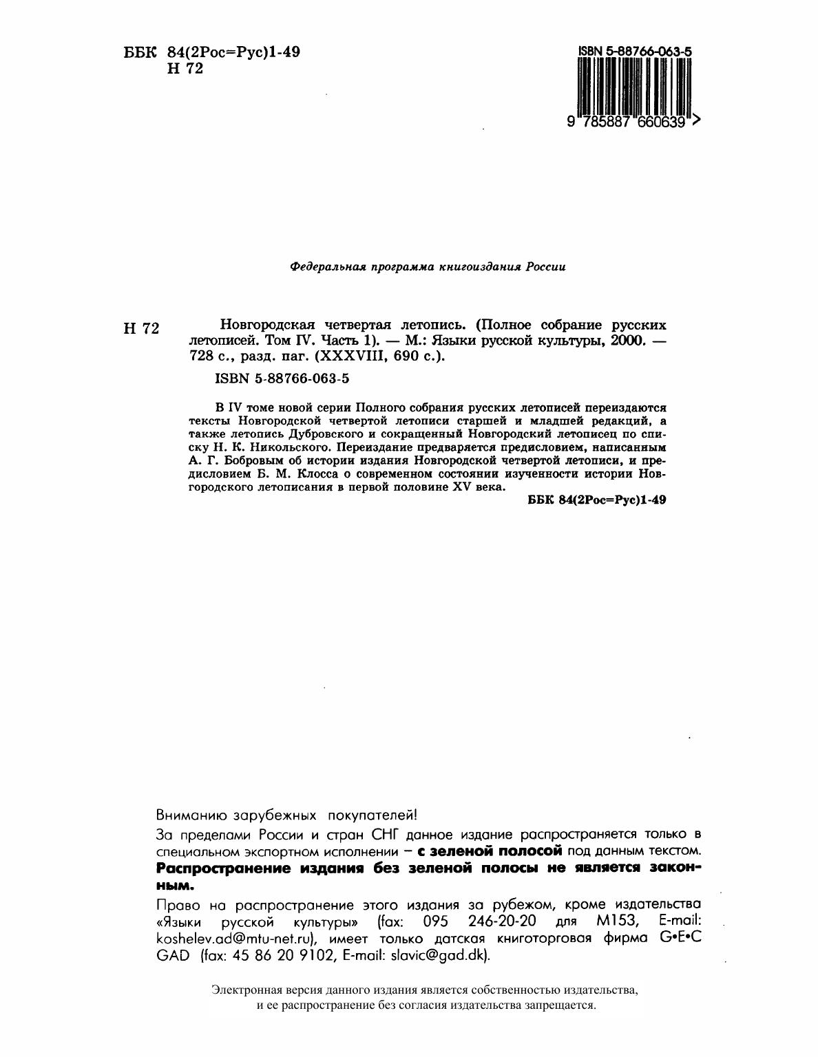 В IV томе новой серии Полного собрания русских летописей переиздаются тексты Новгородской четвертой летописи старшей и младшей редакций, а также летопись Дубровского и сокращенный Новгородский летописец по списку Н.К. Никольского. Переиздание предваряется предисловием, написанным А.Г. Бобровым об истории издания Новгородской четвертой летописи, и предисловием Б.М. Клосса о современном состоянии изученности истории Новгородского летописания в первой половине XV века. Книга предназначена для историков, филологов и всех интересующихся древнерусской литературой и историей культуры.