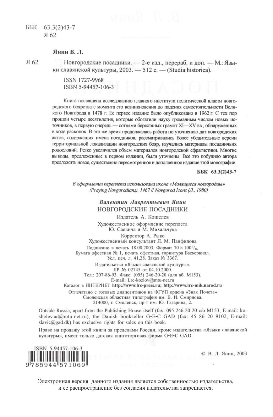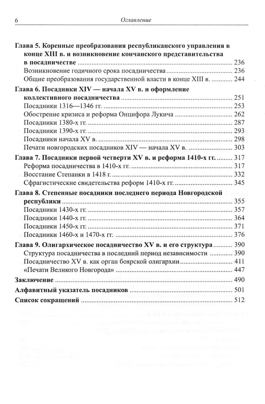 Книга посвящена исследованию главного института политической власти новгородского боярства с момента его возникновения до падения самостоятельности Великого Новгорода в 1478 г. Ее первое издание было опубликовано в 1962 г. С тех пор прошли четыре десятилетия, которые обогатили науку громадным числом новых источников, в первую очередь - сотнями берестяных грамот XI-XV вв., обнаруженных в ходе раскопок. В это же время продолжалась работа по уточнению дат новгородских актов, содержащих имена посадников, рассматривались более убедительные версии территориатьной локализации новгородских бояр, изучались материалы посадничьих родословий. Резко увеличился объем материалов новгородской сфрагистики. Многие выводы, предложенные в первом издании, были уточнены. Всё это побудило автора предложить новое, существенно пересмотренное и дополненное издание этой монографии.