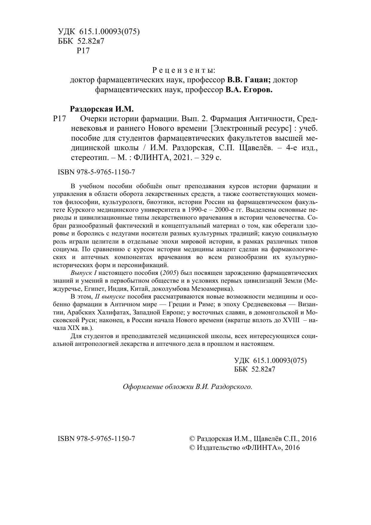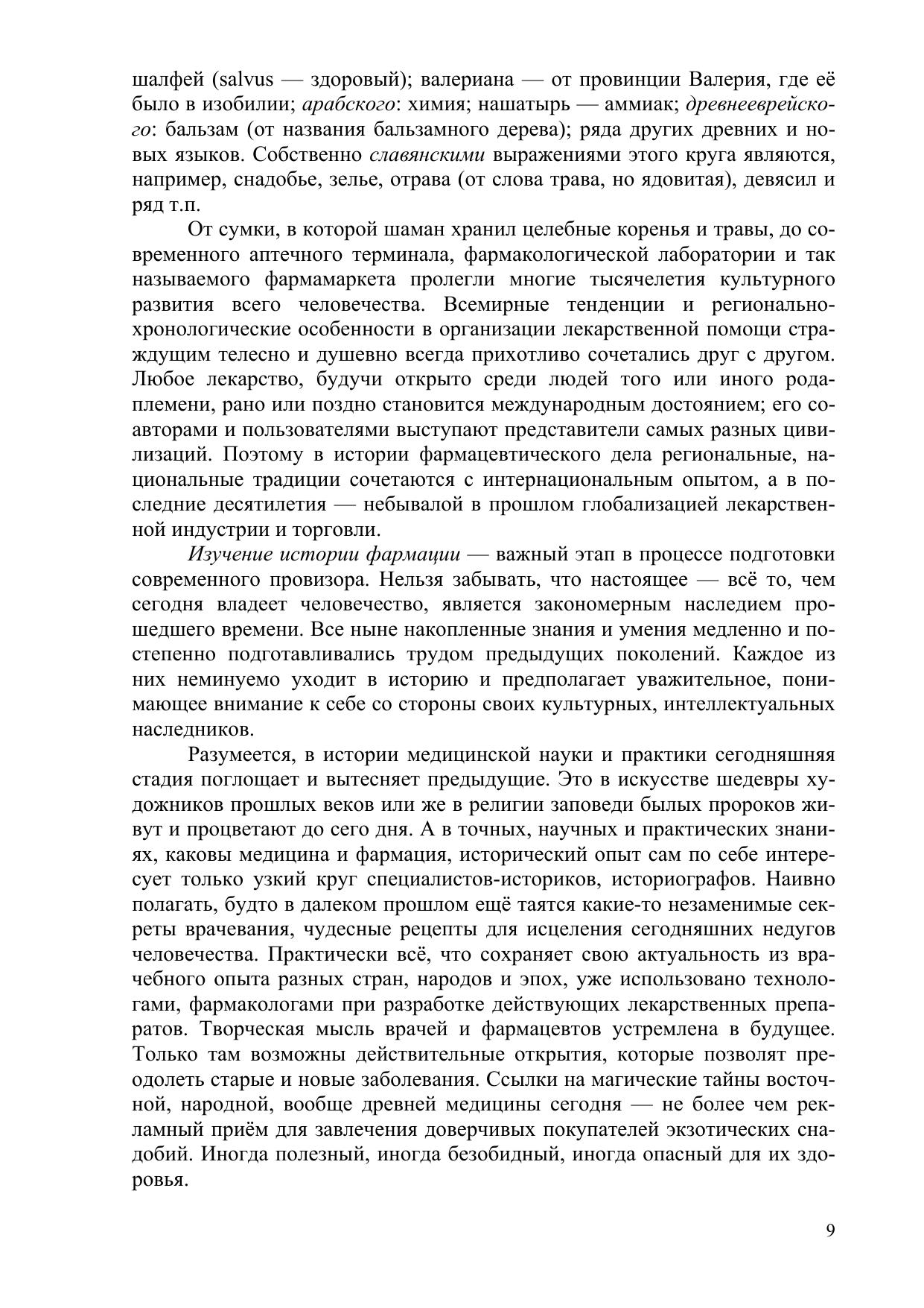 В учебном пособии обобщён опыт преподавания курсов истории фармации и управления в области оборота лекарственных средств, а также соответствующих моментов философии, культурологи, биоэтики, истории России на фармацевтическом факультете Курского медицинского университета в 1990-е – 2000-е гг. Выделены основные периоды и цивилизационные типы лекарственного врачевания в истории человечества. Собран разнообразный фактический и концептуальный материал о том, как оберегали здоровье и боролись с недугами носители разных культурных традиций; какую социальную роль играли целители в отдельные эпохи мировой истории, в рамках различных типов социума. По сравнению с курсом истории медицины акцент сделан на фармакологических и аптечных компонентах врачевания во всем разнообразии их культурноисторических форм и персонификаций. Выпуск I настоящего пособия (2005) был посвящен зарождению фармацевтических знаний и умений в первобытном обществе и в условиях первых цивилизаций Земли (Междуречье, Египет, Индия, Китай, доколумбова Мезоамерика). В этом, II выпуске пособия рассматриваются новые возможности медицины и особенно фармации в Античном мире – Греции и Риме; в эпоху Средневековья – Византии, Арабских Халифатах, Западной Европе; у восточных славян, в домонгольской и Московской Руси; наконец, в России начала Нового времени (вкратце вплоть до XVIII – начала XIX вв.). Для студентов и преподавателей медицинской школы, всех интересующихся социальной антропологией лекарства и аптечного дела в прошлом и настоящем.