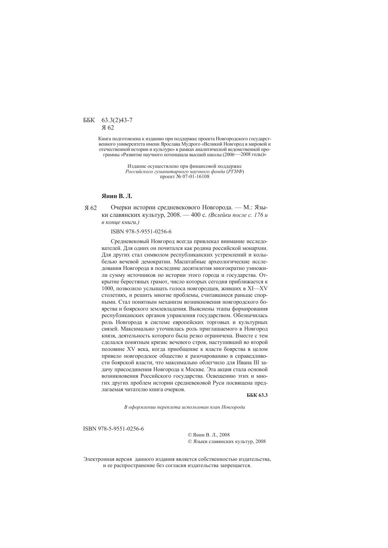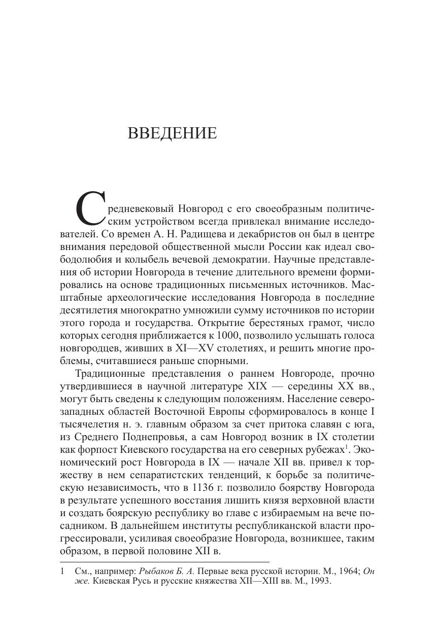 Средневековый Новгород всегда привлекал внимание исследователей. Для одних он почитался как родина российской монархии. Для других стал символом республиканских устремлений и колыбелью вечевой демократии. Масштабные археологические исследования Новгорода в последние десятилетия многократно умножили сумму источников по истории этого города и государства. Открытие берестяных грамот, число которых сегодня приближается к 1000, позволило услышать голоса новгородцев, живших в XI—XV столетиях, и решить многие проблемы, считавшиеся раньше спорными. Стал понятным механизм возникновения новгородского боярства и боярского землевладения. Выяснены этапы формирования республиканских органов управления государством. Обозначилась роль Новгорода в системе европейских торговых и культурных связей. Максимально уточнилась роль приглашаемого в Новгород князя, деятельность которого была резко ограничена. Вместе с тем сделался понятным кризис вечевого строя, наступивший во второй половине XV века, когда приобщение к власти боярства в целом привело новгородское общество к разочарованию в справедливости боярской власти, что максимально облегчило для Ивана Ш задачу присоединения Новгорода к Москве. Эта акция стала основой возникновения Российского государства. Освещению этих и многих других проблем истории средневековой Руси посвящена предлагаемая читателю книга очерков.
