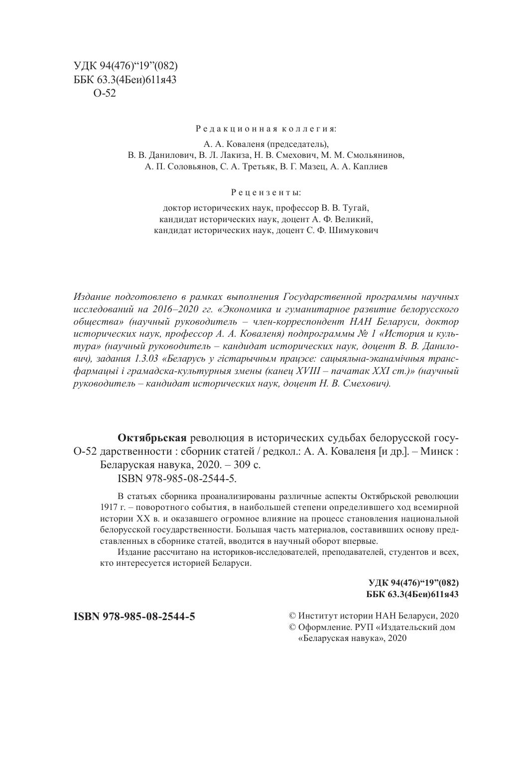 В статьях сборника проанализированы различные аспекты Октябрьской революции 1917 г. – поворотного события, в наибольшей степени определившего ход всемирной истории ХХ в. и оказавшего огромное влияние на процесс становления национальной белорусской государственности. Большая часть материалов, составивших основу представленных в сборнике статей, вводится в научный оборот впервые.