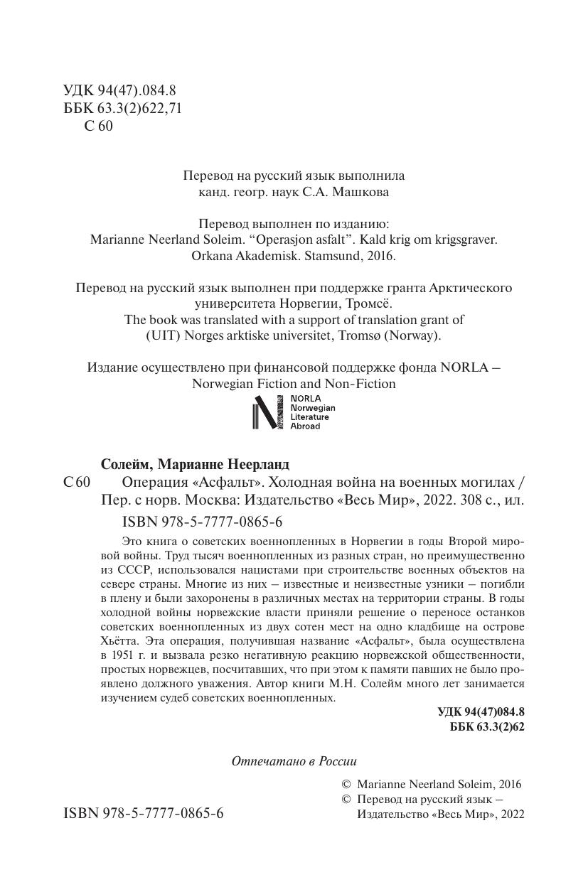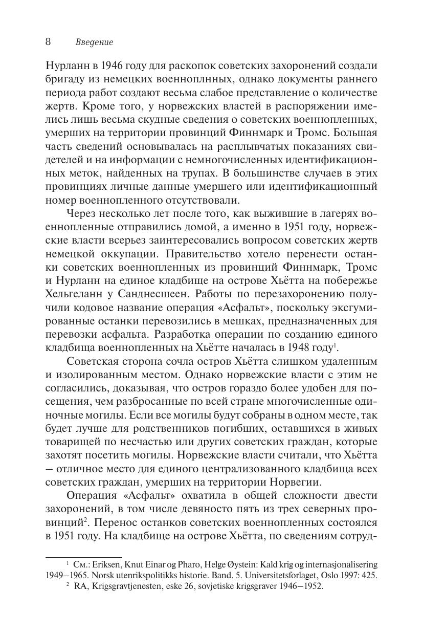 Это книга о советских военнопленных в Норвегии в годы Второй мировой войны. Труд тысяч военнопленных из разных стран, но преимущественно из СССР, использовался нацистами при строительстве военных объектов на севере страны. Многие из них – известные и неизвестные узники – погибли в плену и были захоронены в различных местах на территории страны. В годы холодной войны норвежские власти приняли решение о переносе останков советских военнопленных из двух сотен мест на одно кладбище на острове Хьётта. Эта операция, получившая название «Асфальт», была осуществлена в 1951 г. и вызвала резко негативную реакцию норвежской общественности, простых норвежцев, посчитавших, что при этом к памяти павших не было проявлено должного уважения. Автор книги М.Н. Солейм много лет занимается изучением судеб советских военнопленных.