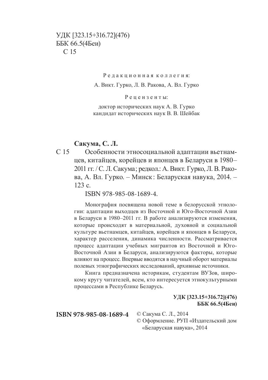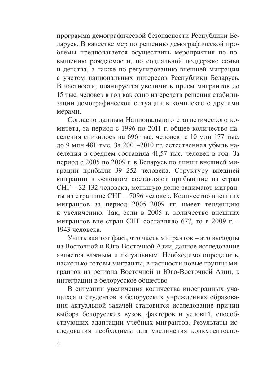 Монография посвящена новой теме в белорусской этно логии: адаптации выходцев из Восточной и ЮгоВосточной Азии в Беларуси в 1980–2011 гг. В работе анализируются изменения, которые происходят в материальной, духовной и социальной культуре вьетнамцев, китайцев, корейцев и японцев в Беларуси, характер расселения, динамика численности. Рассматривается процесс адаптации учебных мигрантов из Восточной и ЮгоВосточной Азии в Беларуси, анализируются факторы, которые влияют на процесс. Впервые вводятся в научный оборот материалы полевых этнографических исследований, архивные источники. Книга предназначена историкам, студентам ВУЗов, широкому кругу читателей, всем, кто интересуется этнокультурными процессами в Республике Беларусь.