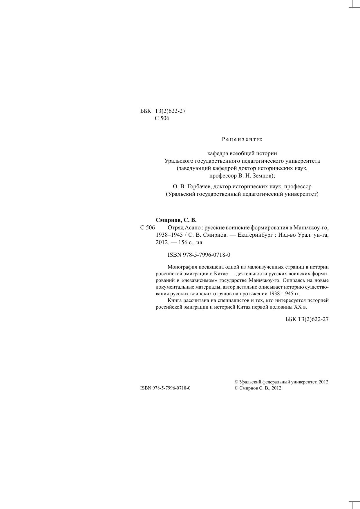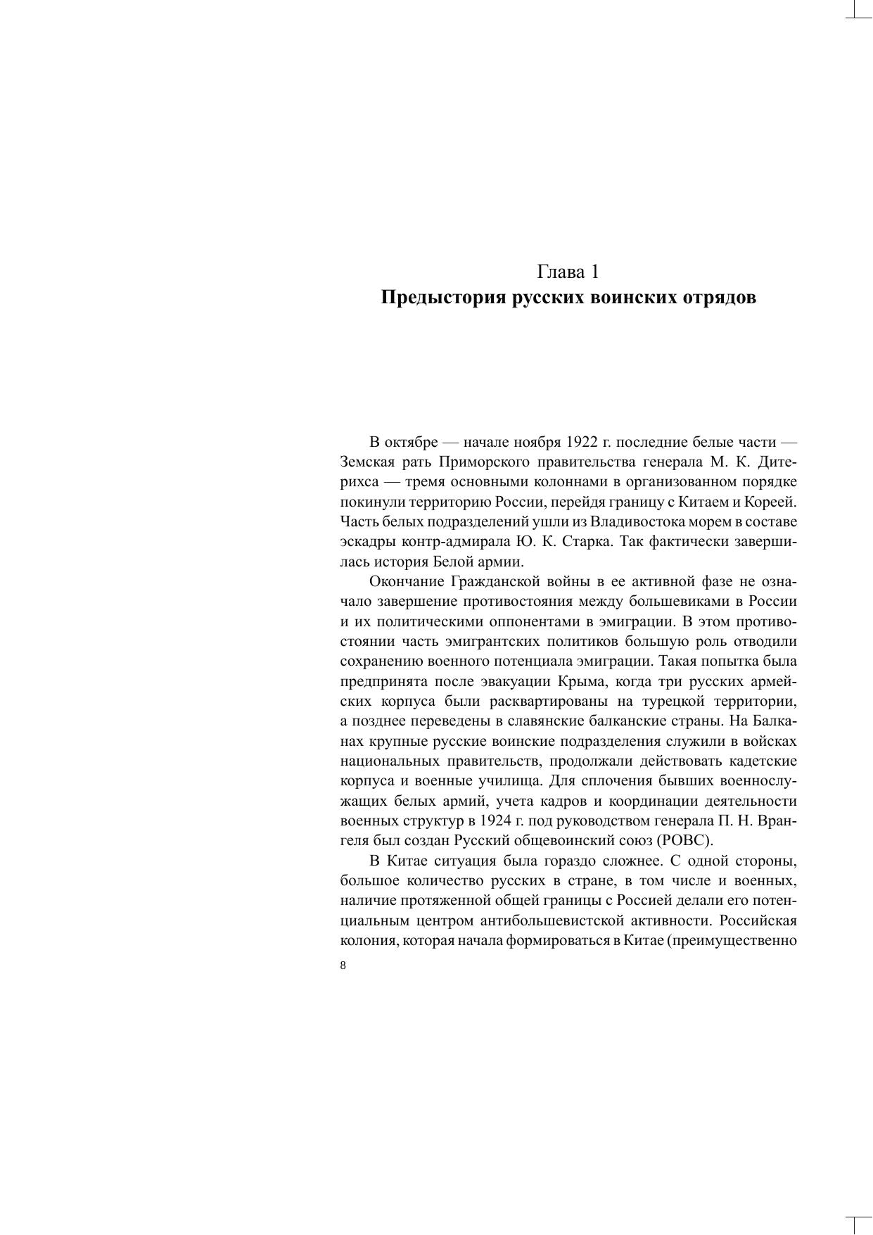 Монография посвящена одной из малоизученных страниц в истории российской эмиграции в Китае — деятельности русских воинских формирований в «независимом» государстве Маньчжоу-го. Опираясь на новые документальные материалы, автор детально описывает историю существования русских воинских отрядов на протяжении 1938-1945 гг. Книга рассчитана на специалистов и тех, кто интересуется историей российской эмиграции и историей Китая первой половины XX в.