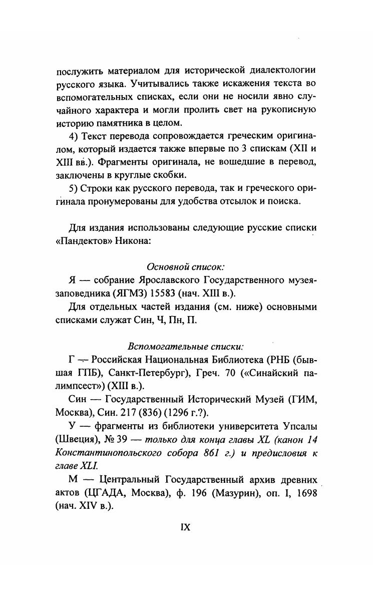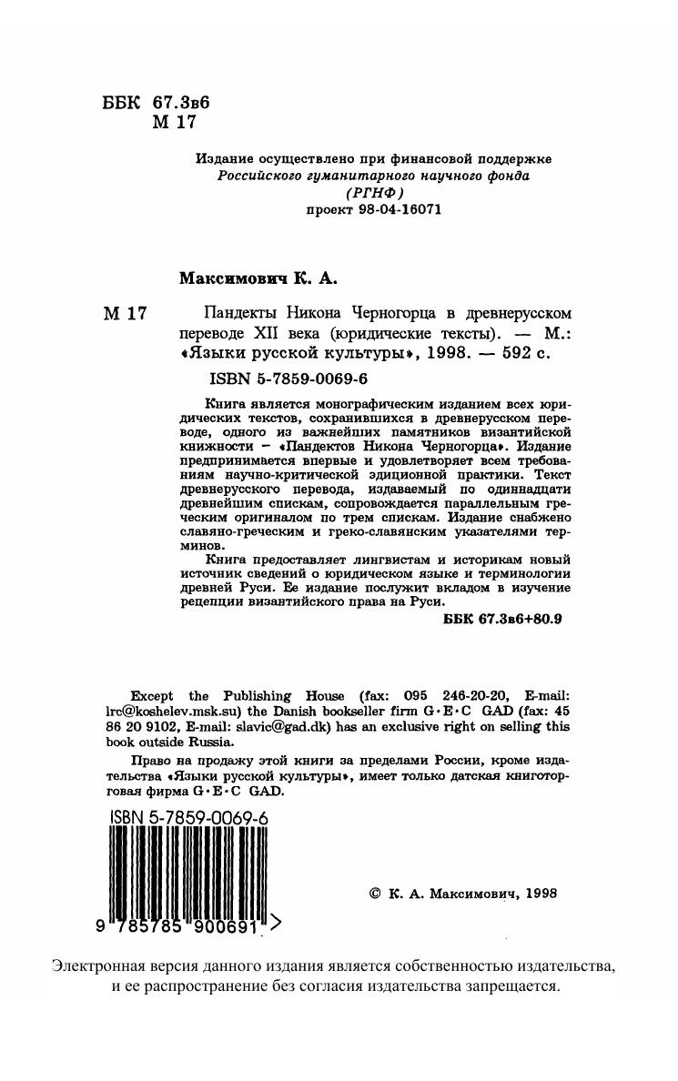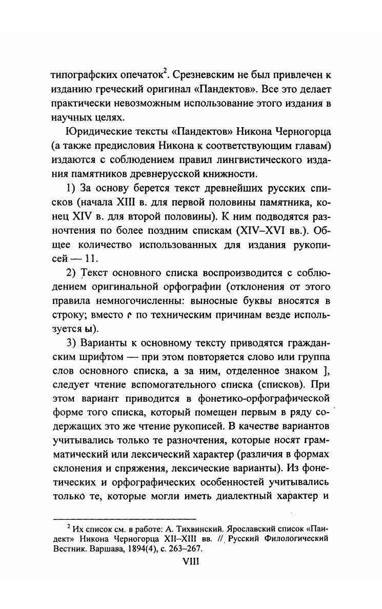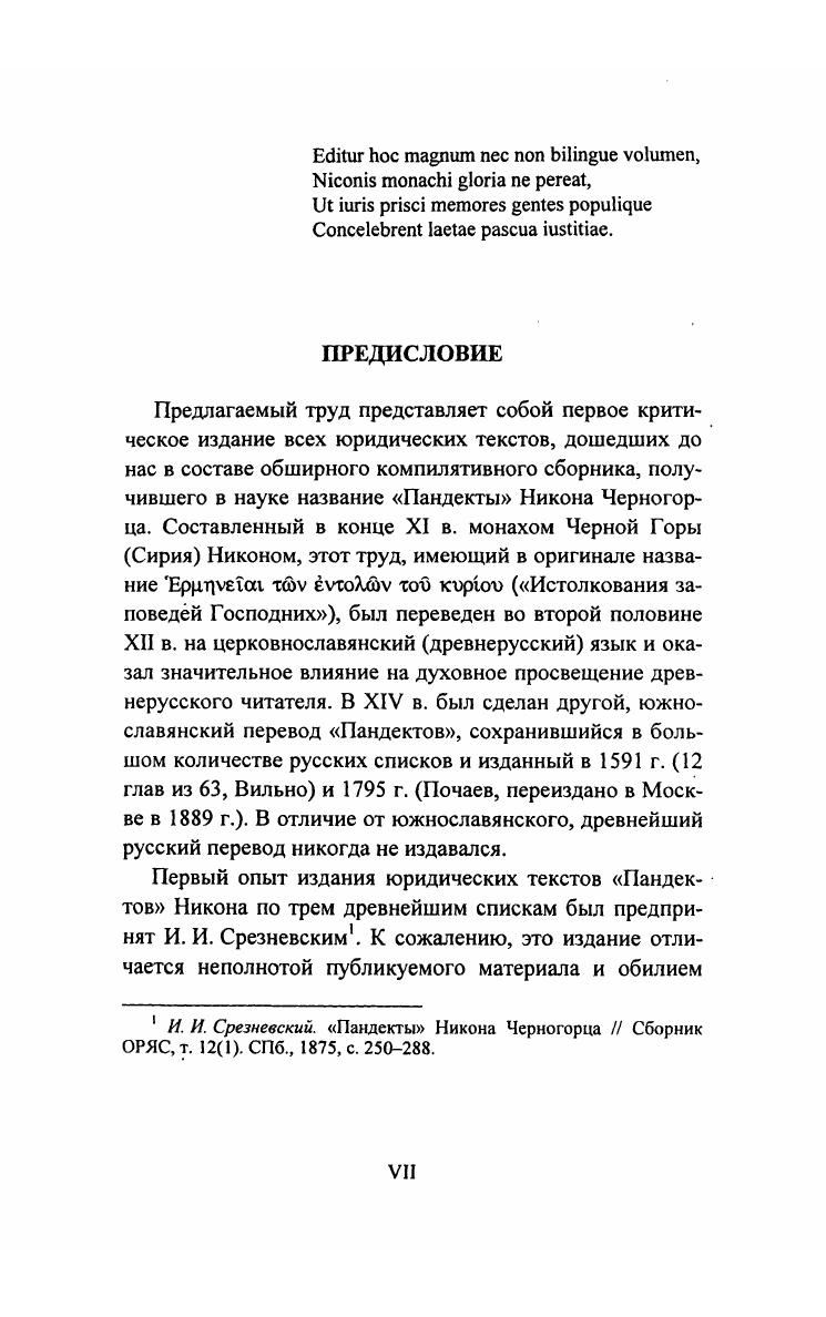 Книга является монографическим изданием всех юридических текстов, сохранившихся в древнерусском переводе, одного из важнейших памятников византийской книжности - "Пандектов Никона Черногорца". Издание предпринимается впервые и удовлетворяет всем требованиям научно-критической эдиционной практики. Текст древнерусского перевода, издаваемый по одиннадцати древнейшим спискам, сопровождается параллельным греческим оригиналом по трем спискам. Издание снабжено славяно-греческим и греко-славянским указателями терминов. Книга предоставляет лингвистам и историкам новый источник сведений о юридическом языке и терминологии древней Руси.