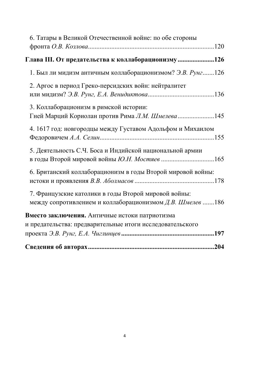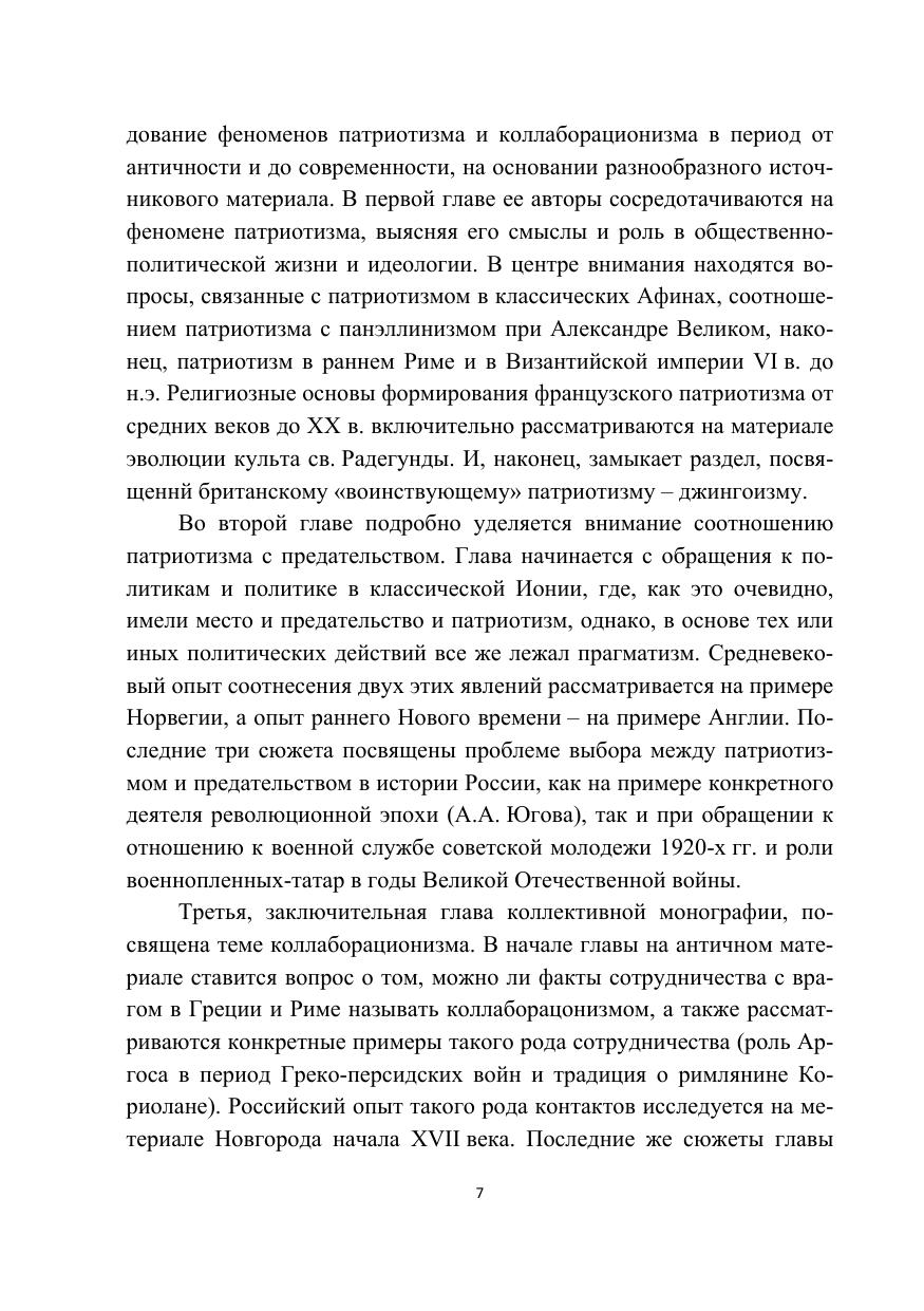 В данной коллективной монографии ее авторы, будучи специалистами по различным периодам всемирной и отечественной истории, впервые в отечественной исторической науке предлагают исследование феноменов патриотизма и коллаборационизма в период от античности и до современности, на основании разнообразного источникового материала. Книга предназначена для студентов, аспирантов, преподавателей и научных работников, занимающихся изучением вопросов войны и мира, политических и идеологических процессов в обществе, а также социокультурных процессов во всемирной истории.