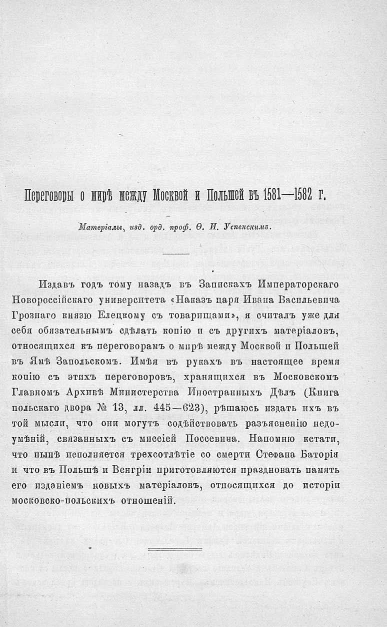 Переговоры о мире между Москвой и Польшей в 1581—1582 г.: Материалы, изд. орд. проф. Ф. И. Успенским. — Одесса: тип. Одес. вестн., 1887. — [2], 84 с.